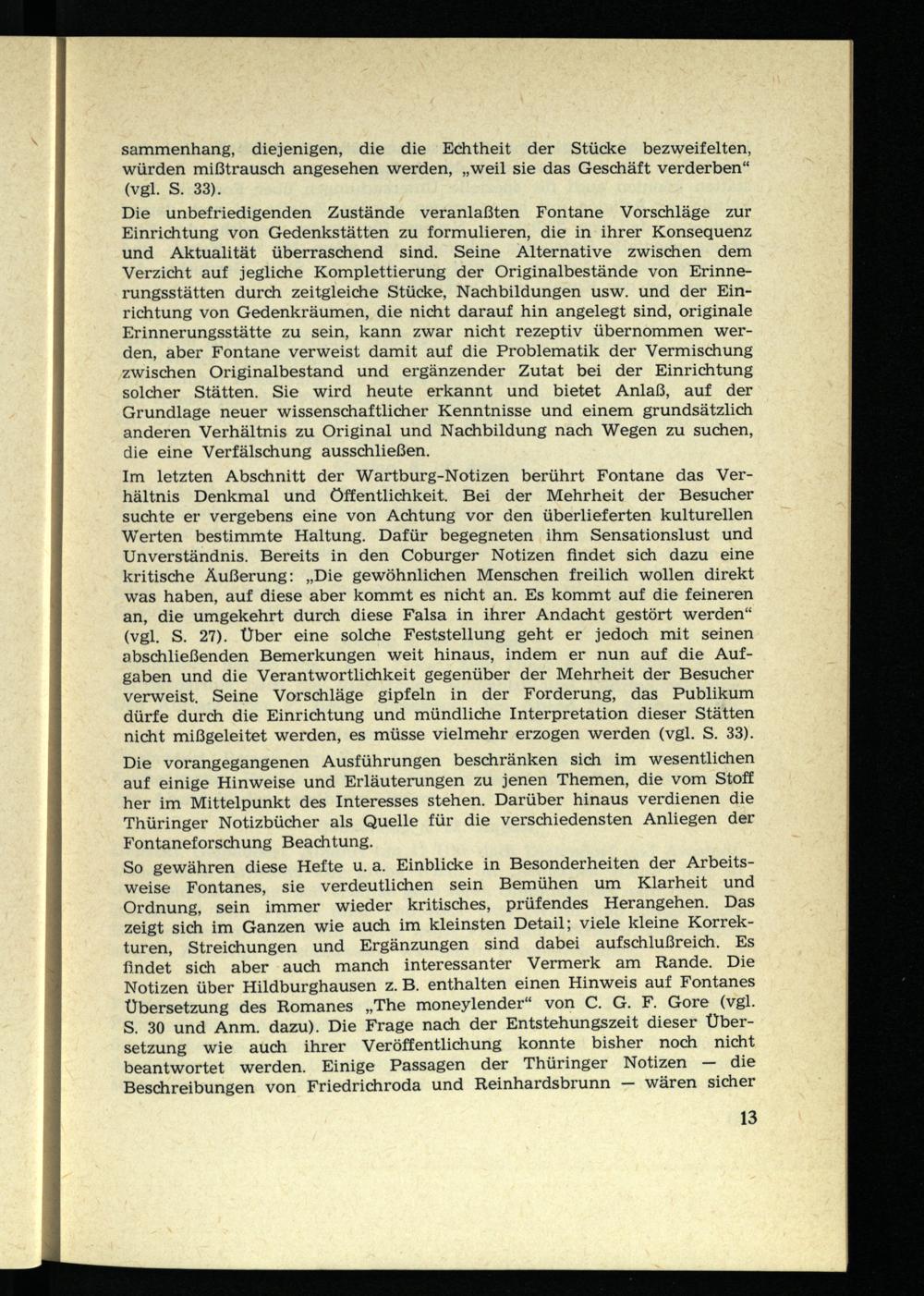So gewähren diese Hefte u. a. Einblicke in Besonderheiten der Arbeitsweise Fontanes, sie verdeutlichen sein Bemühen um Klarheit und Ordnung, sein immer wieder kritisches, prüfendes Herangehen. Das zeigt sich im Ganzen wie auch im kleinsten Detail; viele kleine Korrekturen, Streichungen und Ergänzungen sind dabei aufschlußreich. Es findet sich aber auch manch interessanter Vermerk am Rande. Die Notizen über Hildburghausen z. B. enthalten einen Hinweis auf Fontanes Übersetzung des Romanes „The moneylender“ von C. G. F. Gore (vgl. S. 30 und Anm. dazu). Die Frage nach der Entstehungszeit dieser Übersetzung wie auch ihrer Veröffentlichung konnte bisher noch nicht beantwortet werden. Einige Passagen der Thüringer Notizen — die Beschreibungen von Friedrichroda und Reinhardsbrunn — wären sicher