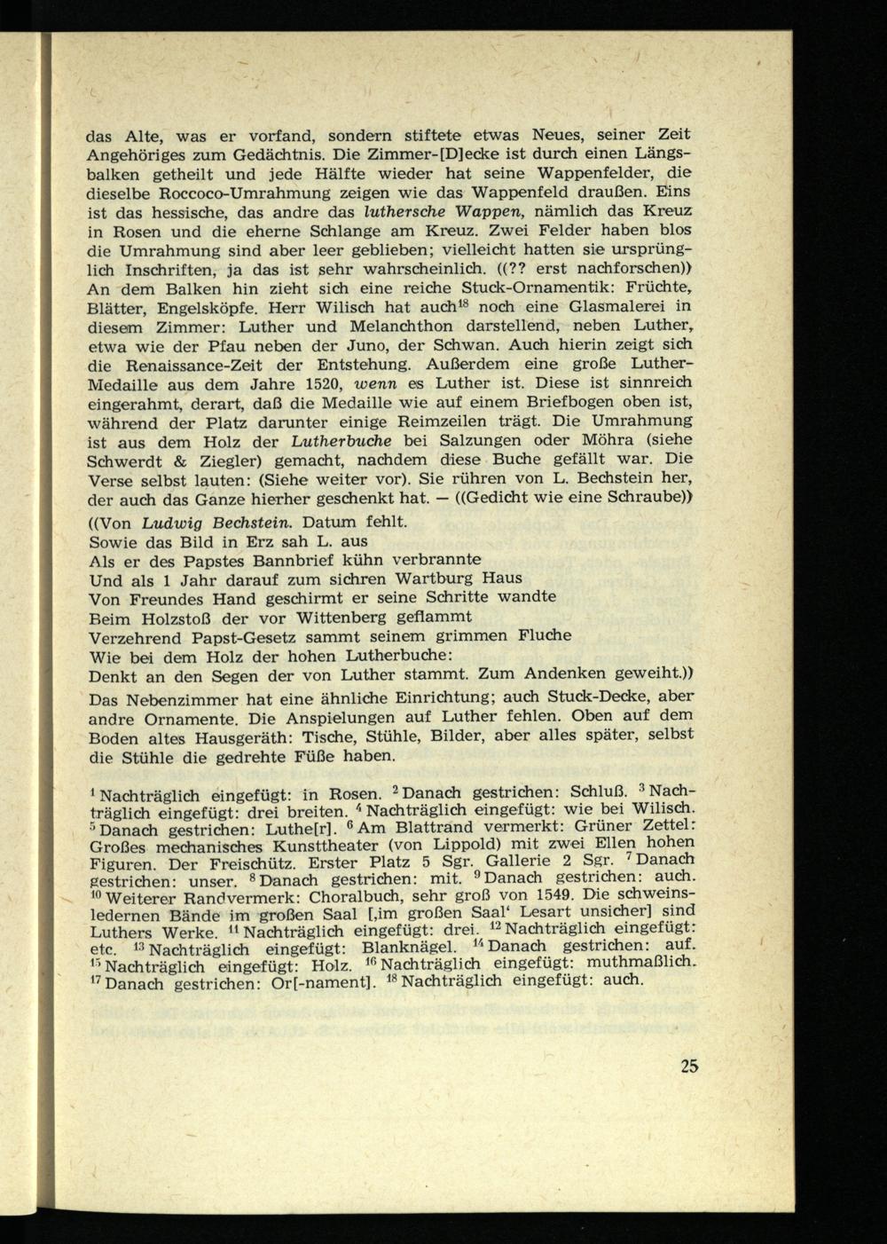 das Alte, was er vorfand, sondern stiftete etwas Neues, seiner Zeit Angehöriges zum Gedächtnis. Die Zimmer-[D]ecke ist durch einen Längsbalken getheilt und jede Hälfte wieder hat seine Wappenfelder, die dieselbe Roccoco-Umrahmung zeigen wie das Wappenfeld draußen. Eins ist das hessische, das andre das luthersche Wappen, nämlich das Kreuz in Rosen und die eherne Schlange am Kreuz. Zwei Felder haben blos die Umrahmung sind aber leer geblieben; vielleicht hatten sie ursprünglich Inschriften, ja das ist sehr wahrscheinlich. ((?? erst nachforschen)) An dem Balken hin zieht sich eine reiche Stuck-Ornamentik: Früchte, Blätter, Engelsköpfe. Herr Wilisch hat auch 18 noch eine Glasmalerei in diesem Zimmer: Luther und Melanchthon darstellend, neben Luther, etwa wie der Pfau neben der Juno, der Schwan. Auch hierin zeigt sich die Renaissance-Zeit der Entstehung. Außerdem eine große Luther- Medaille aus dem Jahre 1520, wenn es Luther ist. Diese ist sinnreich eingerahmt, derart, daß die Medaille wie auf einem Briefbogen oben ist, während der Platz darunter einige Reimzeilen trägt. Die Umrahmung ist aus dem Holz der Luthertmche bei Salzungen oder Möhra (siehe Schwerdt & Ziegler) gemacht, nachdem diese Buche gefällt war. Die Verse selbst lauten: (Siehe weiter vor). Sie rühren von L. Bechstein her, der auch das Ganze hierher geschenkt hat. — ((Gedicht wie eine Schraube)) ((Von Ludwig Bechstein. Datum fehlt.