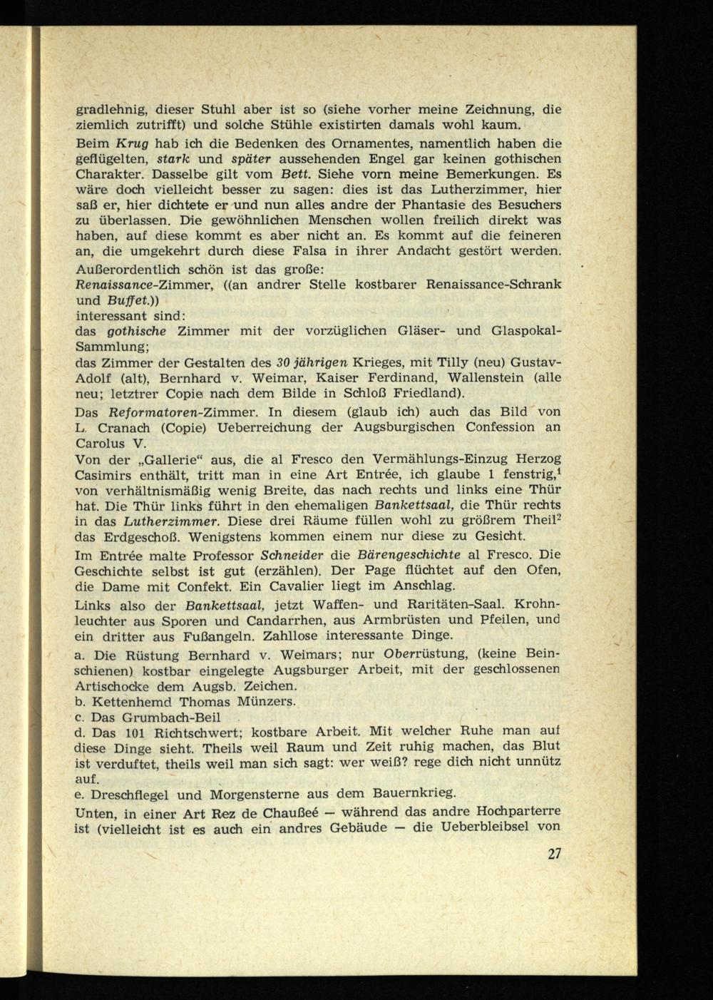Von der „Gallerie“ aus, die al Fresco den Vermählungs-Einzug Herzog Casimirs enthält, tritt man in eine Art Entree, ich glaube 1 fenstrig, 1 von verhältnismäßig wenig Breite, das nach rechts und links eine Thür hat. Die Thür links führt in den ehemaligen Bankettsaal, die Thür rechts in das Lutherzimmer. Diese drei Räume füllen wohl zu größrem Theil 2 das Erdgeschoß. Wenigstens kommen einem nur diese zu Gesicht.