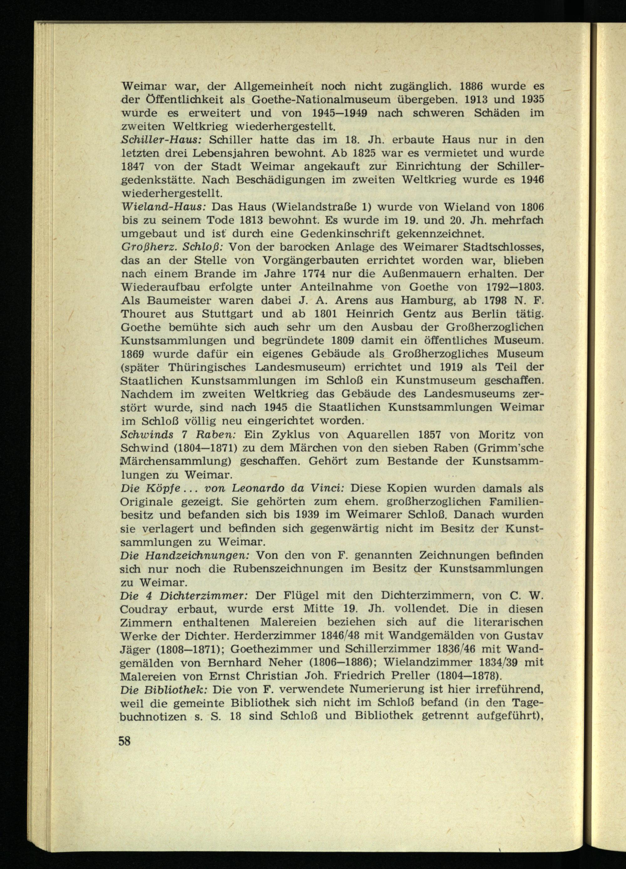 Croßherz. Schloß: Von der barocken Anlage des Weimarer Stadtschlosses, das an der Stelle von Vorgängerbauten errichtet worden war, blieben nach einem Brande im Jahre 1774 nur die Außenmauern erhalten. Der Wiederaufbau erfolgte unter Anteilnahme von Goethe von 1792—1803. Als Baumeister waren dabei J. A. Arens aus Hamburg, ab 1798 N. F. Thouret aus Stuttgart und ab 1801 Heinrich Gentz aus Berlin tätig. Goethe bemühte sich auch sehr um den Ausbau der Großherzoglichen Kunstsammlungen und begründete 1809 damit ein öffentliches Museum. 1869 wurde dafür ein eigenes Gebäude als Großherzogliches Museum (später Thüringisches Landesmuseum) errichtet und 1919 als Teil der Staatlichen Kunstsammlungen im Schloß ein Kunstmuseum geschaffen. Nachdem im zweiten Weltkrieg das Gebäude des Landesmuseums zerstört wurde, sind nach 1945 die Staatlichen Kunstsammlungen Weimar im Schloß völlig neu eingerichtet worden.