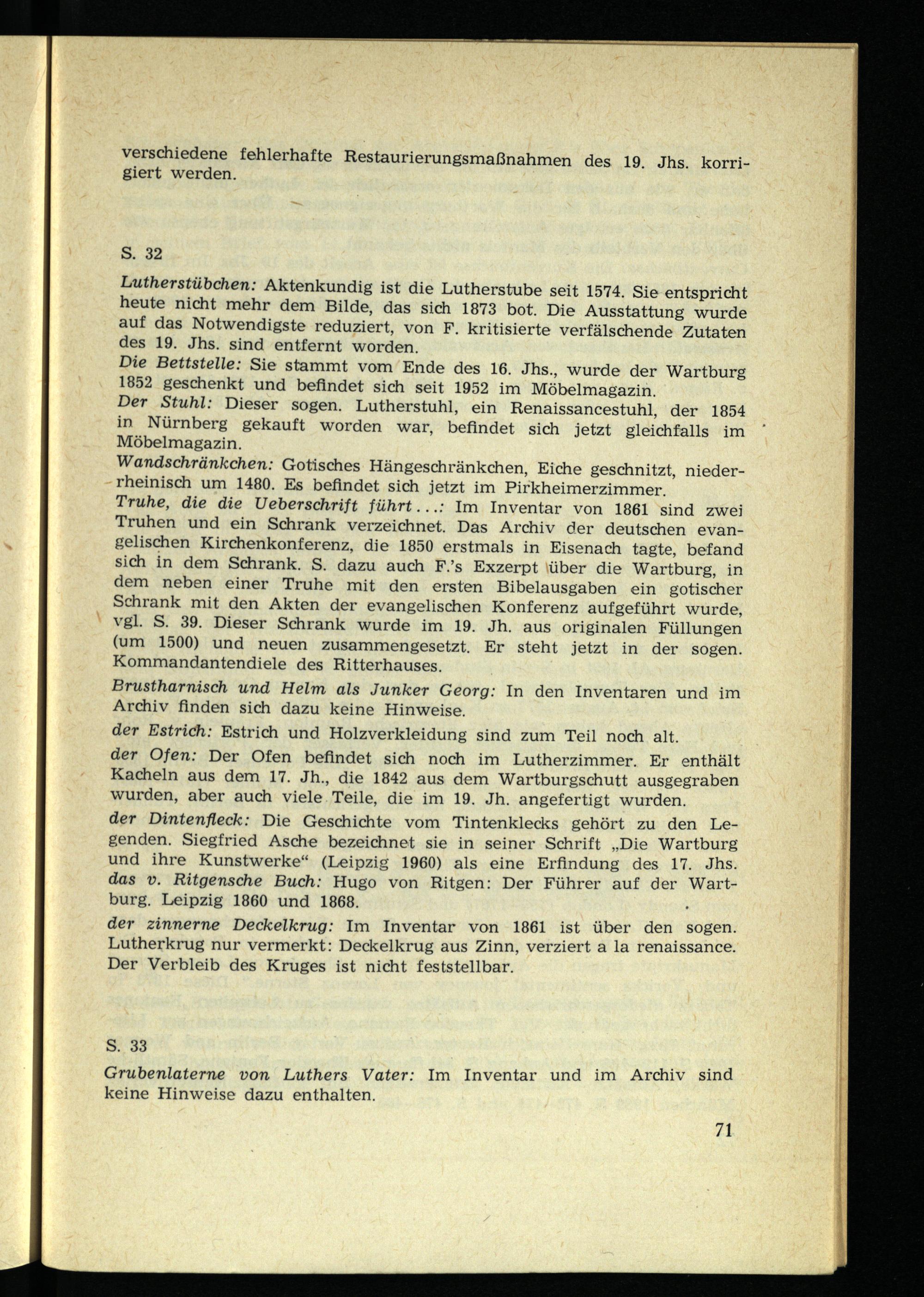 der Estrich: Estrich und Holzverkleidung sind zum Teil noch alt. der Ofen: Der Ofen befindet sich noch im Lutherzimmer. Er enthält Kacheln aus dem 17. Jh., die 1842 aus dem Wartburgschutt ausgegraben wurden, aber auch viele Teile, die im 19. Jh. angefertigt wurden. der Dintenfleck: Die Geschichte vom Tintenklecks gehört zu den Legenden. Siegfried Asche bezeichnet sie in seiner Schrift „Die Wartburg und ihre Kunstwerke“ (Leipzig 1960) als eine Erfindung des 17. Jhs. das v. Ritgensche Buch: Hugo von Ritgen: Der Führer auf der Wartburg. Leipzig 1860 und 1868.