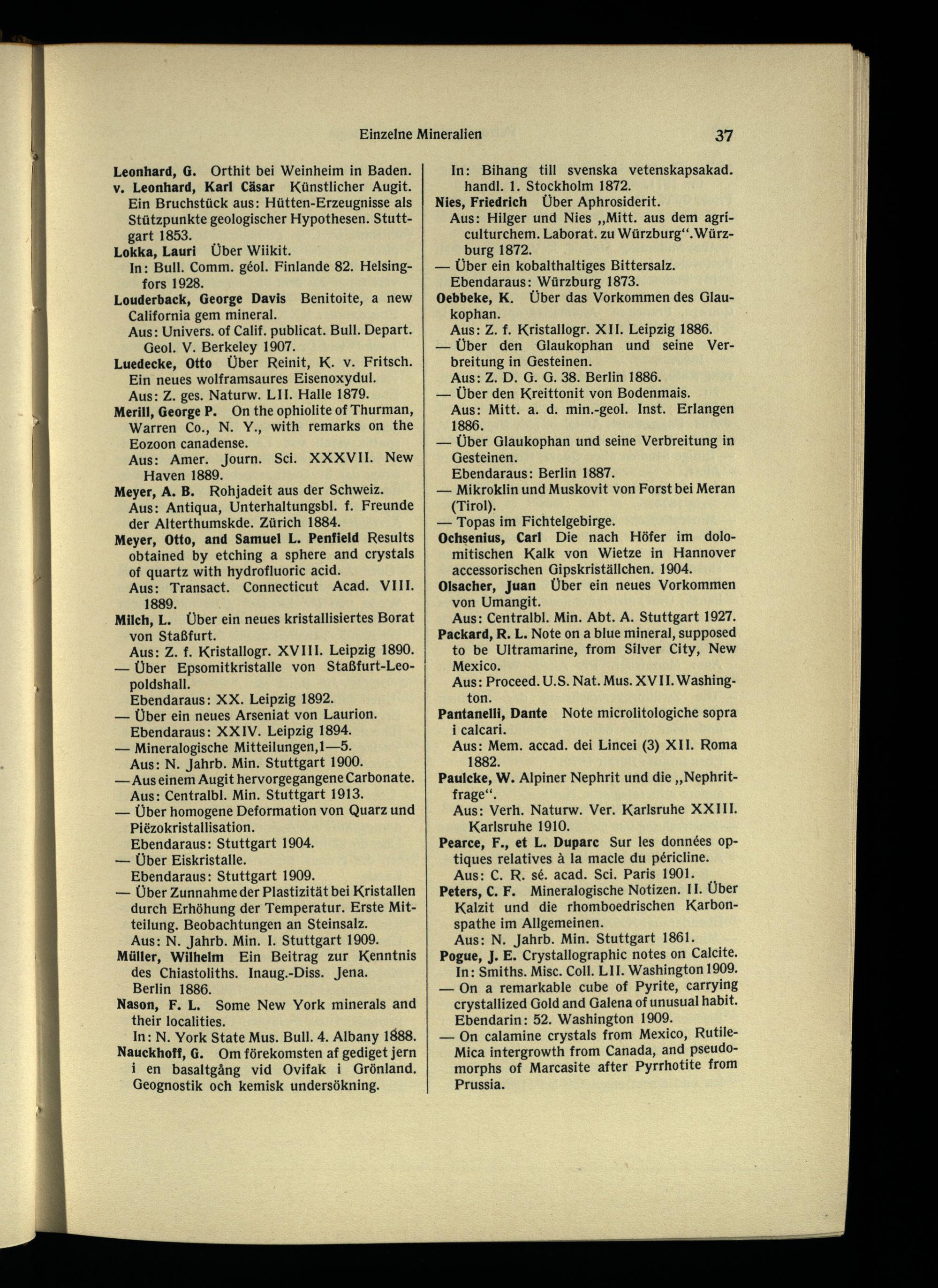 Ochsenius, Carl Die nach Höfer im dolomitischen Kalk von Wietze in Hannover accessorischen Gipskriställchen. 1904. Olsacher, Juan Über ein neues Vorkommen von Umangit.