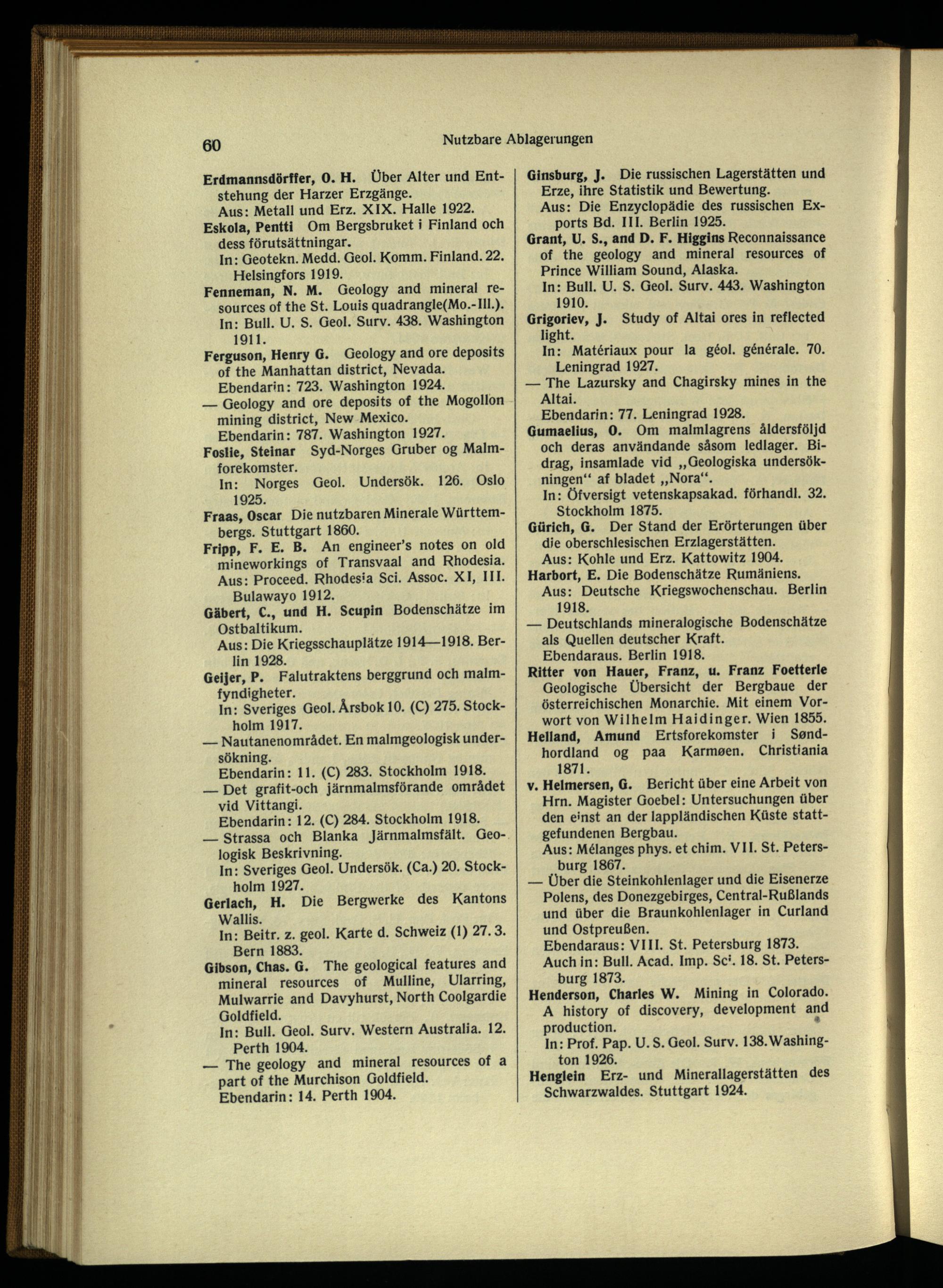 Ritter von Hauer, Franz, u. Franz Foetterle Geologische Übersicht der Bergbaue der österreichischen Monarchie. Mit einem Vorwort von Wilhelm Haidinger . Wien 1855. Heliand, Amund Ertsforekomster i Sond- hordland og paa Karmoen. Christiania 1871.