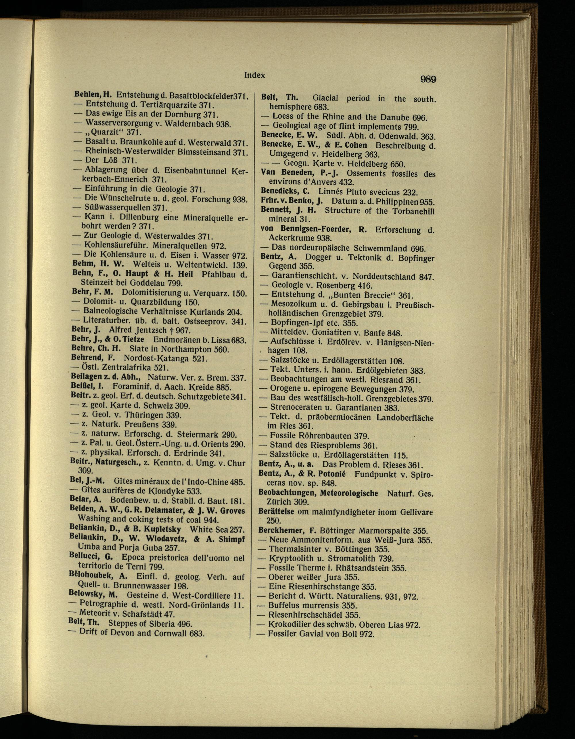 — Geological age of flint implements 799. Benecke, E. W. Sfldl. Abh. d. Odenwald . 363. Benecke, E. W., & E. Cohen Beschreibung d.