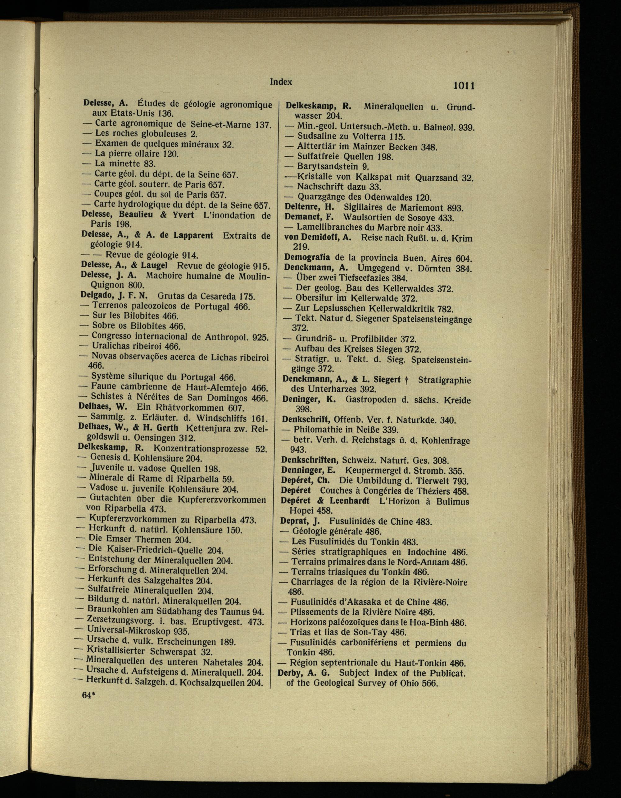 Denkschriften, Schweiz . Naturf. Ges. 308. Denninger, E. Keupermergel d. Stromb. 355. Depéret, Ch. Die Umbildung d. Tierwelt 793. Depéret Couches à Congéries de Théziers 458. Depéret & Leenhardt L’Horizon à Bulimus Hopei 458.