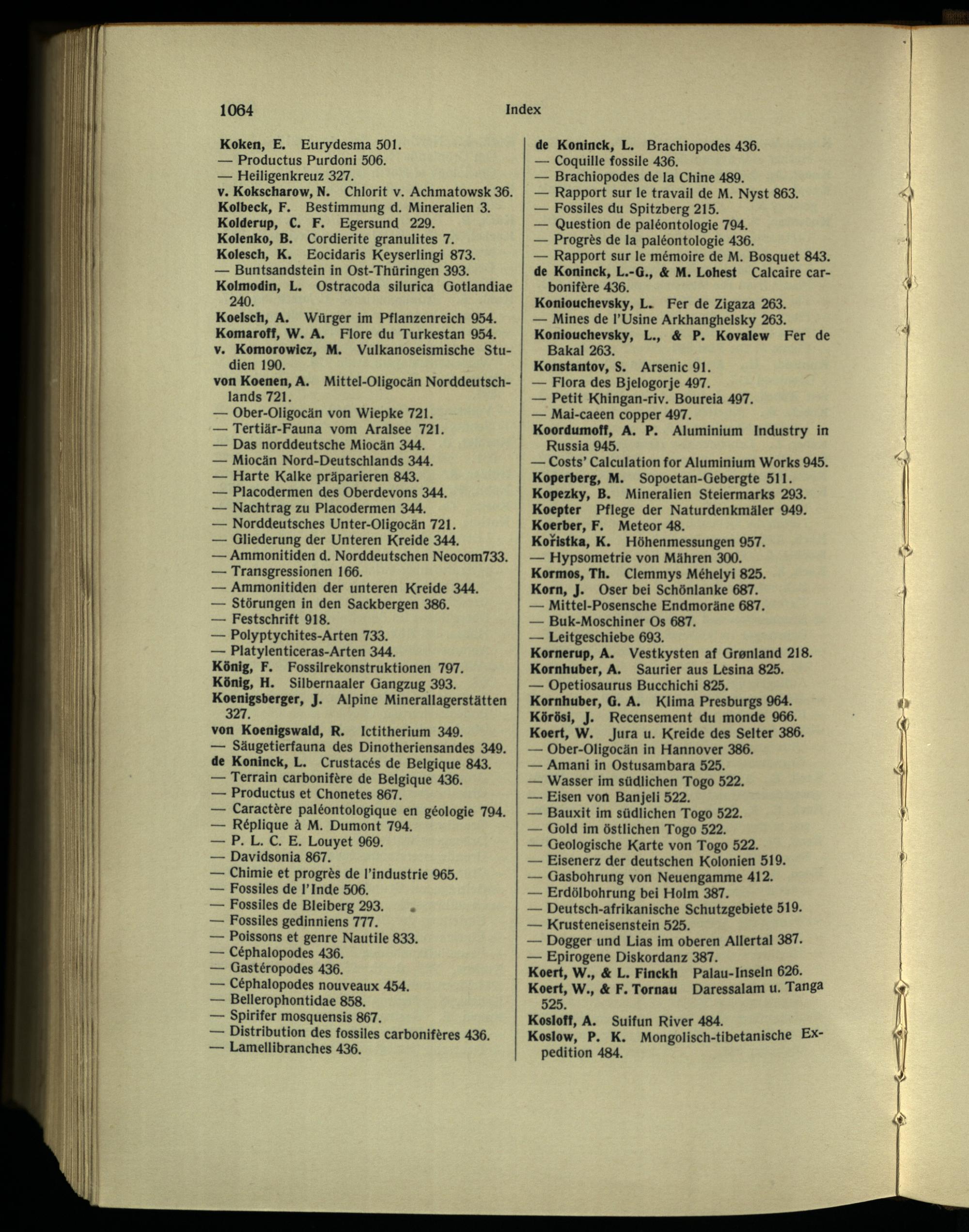 V. Kokscharow, N. Chlorit v. Achmatowsk 36. Kolbeck, F. Bestimmung d. Mineralien 3. Kolderup, C. F. Egersund 229.