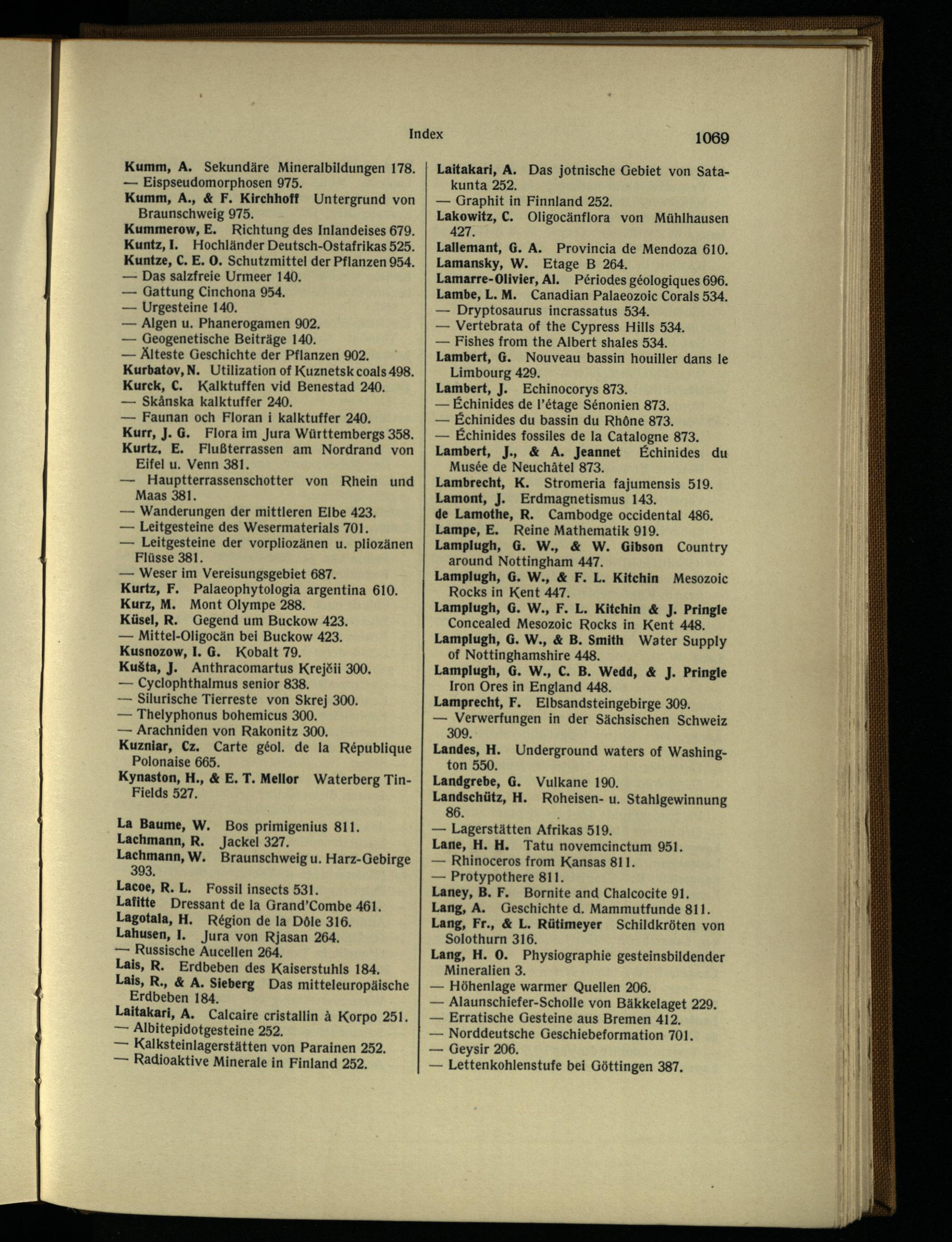 Lambrecht, K. Stromeria fajumensis 519. Lamont, J. Erdmagnetismus 143. de Lamothe, R. Cambodge occidental 486. Lampe, E. Reine Mathematik 919.