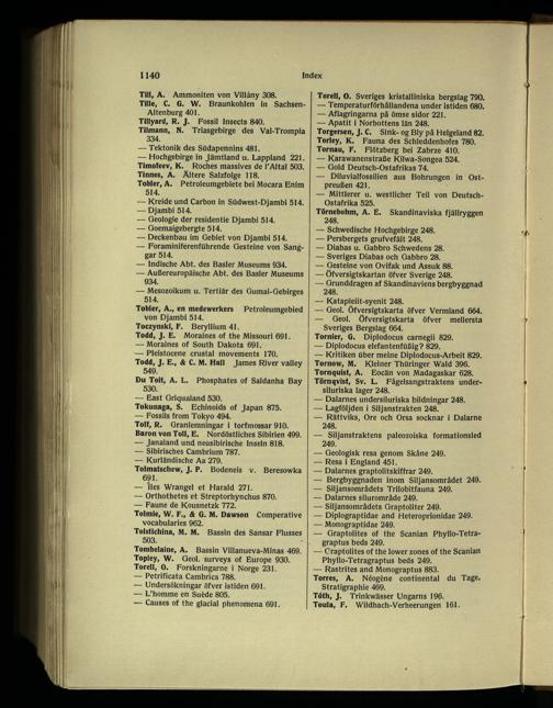 Torgersen, J. C. Sink- og Bly pä Helgeland 82. Torley, K. Fauna des Schieddenhofes 780. Tornau, F. Flötzberg bei Zabrze 410.