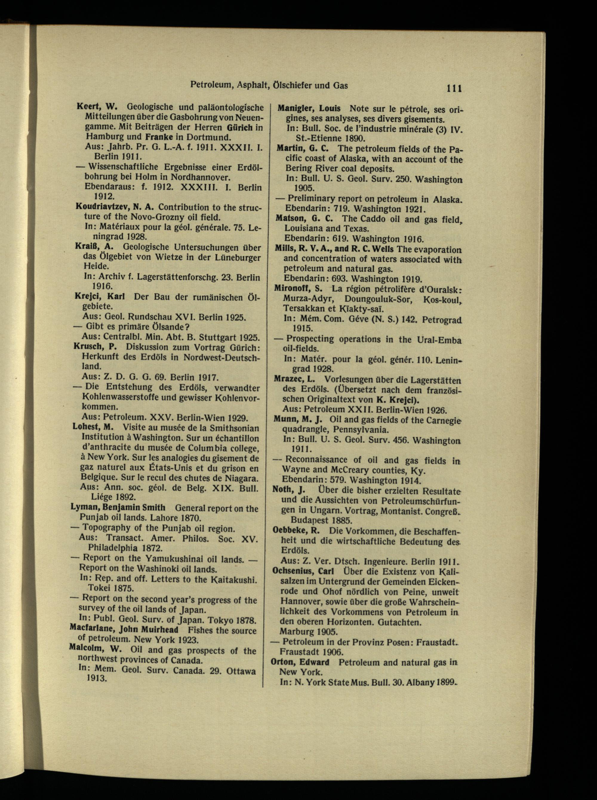 Aus: Petroleum. XXV. Berlin -Wien 1929. Lohest, M. Visite au musée de la Smithsonian Institution à Washington . Sur un échantillon d’anthracite du musée de Columbia college, à New York . Sur les analogies du gisement de gaz naturel aux États-Unis et du grison en Belgique. Sur le recul des chutes de Niagara. Aus: Ann. soc. géol. de Belg . XIX. Bull. Liège 1892.