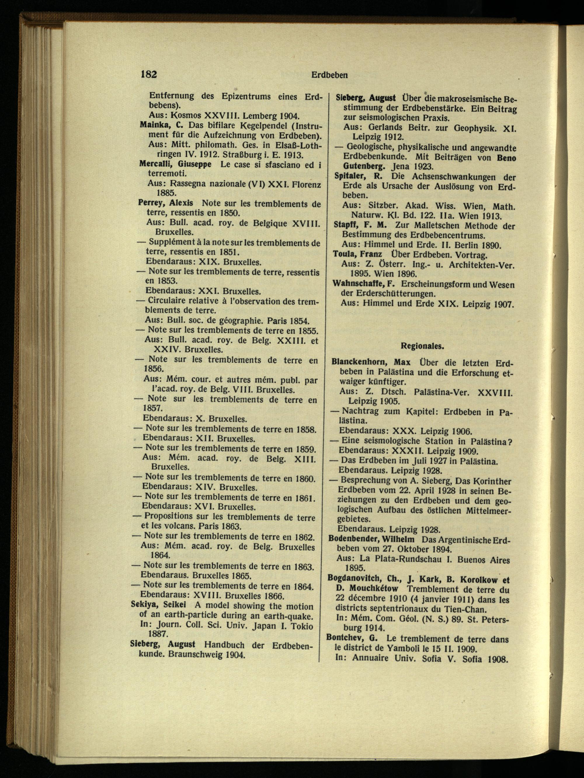 Aus: Kosmos XXVIII. Lemberg 1904. Mainka, C. Das bifiiare Kegelpendel (Instrument für die Aufzeichnung von Erdbeben). Aus: Mitt. philomath. Ges. in Elsaß-Loth ringen IV. 1912. Straßburg i. E. 1913. Mercalll, Giuseppe Le case si sfasciano ed i terremoti.
