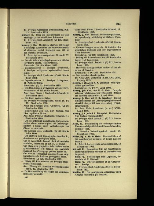 Moberg, Joh. Chr., och N. 0. Holst De syd- skânska rullstensâsarnes vittnesbörd i frägan om istidens kontinuitet. Lund 1899. Moberg, J. Chr., och C. O. Segerberg Bidrag tili kännedomen om Ceratopygeregionen med särskild hänsyn till dess utveckling i Fogel- sângstrakten.