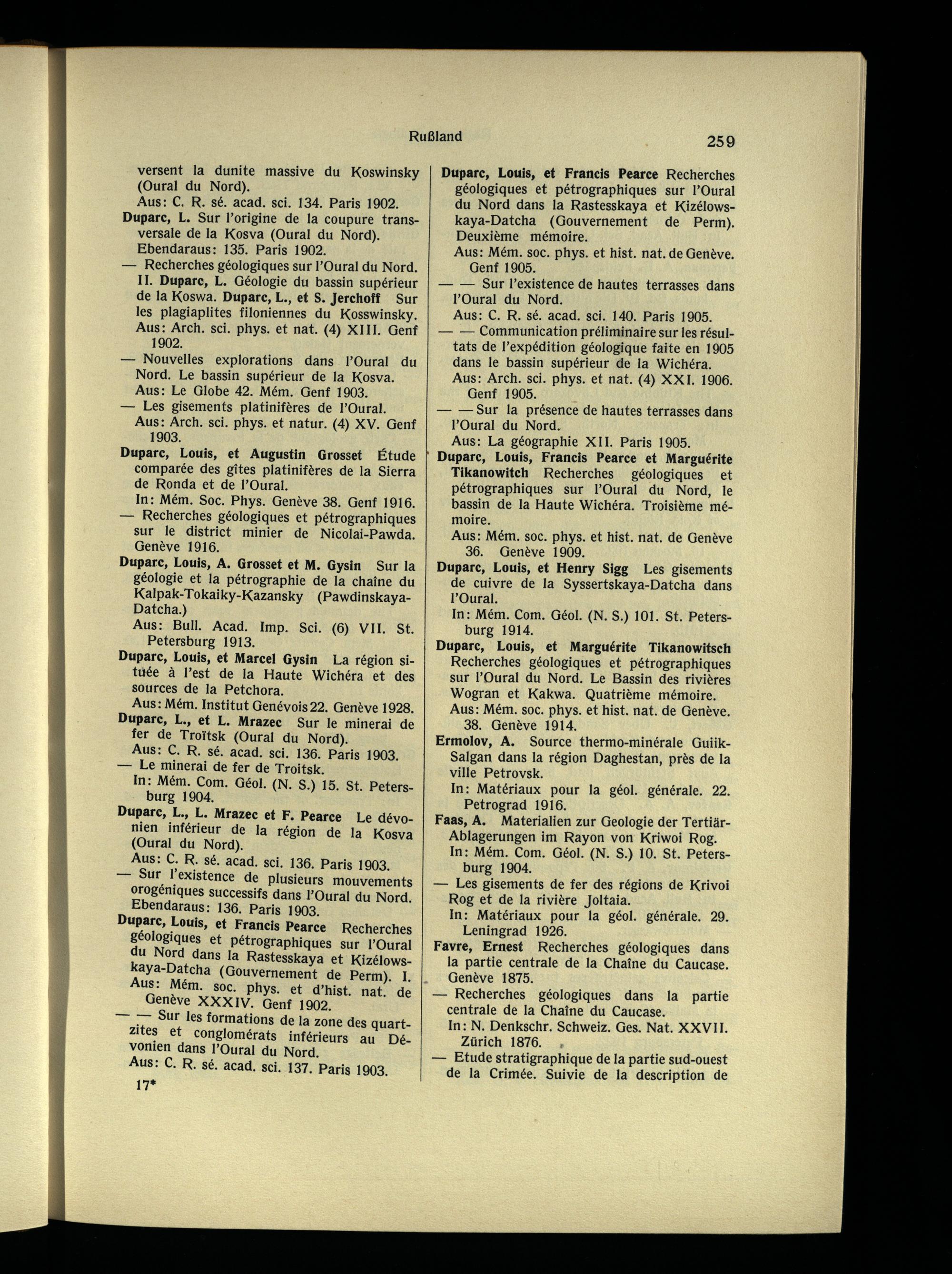Duparc, Louis, et Francis Pearce Recherches géologiques et pétrographiques sur l’Oural du Nord dans la Rastesskaya et Kizélows- kaya-Datcha (Gouvernement de Perm ). I. Aus: Mém. soc. phys. et d’hist. nat. de Genève XXXIV. Genf 1902.