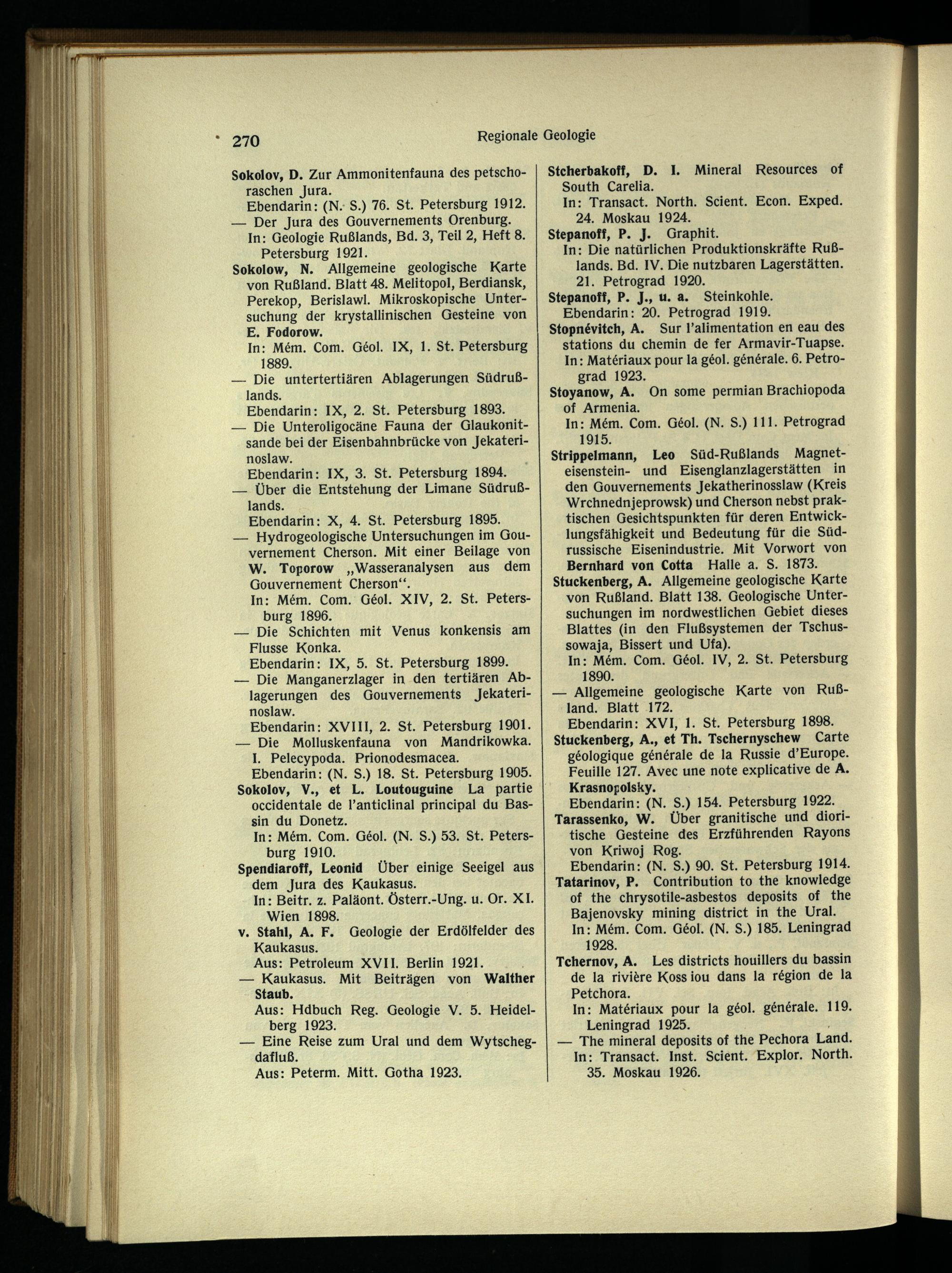 Strippelmann, Leo Süd-Rußlands Magnet eisenstein - und Eisenglanzlagerstätten in den Gouvernements Jekatherinosslaw (Kreis Wrchnednjeprowsk) und Cherson nebst praktischen Gesichtspunkten für deren Entwicklungsfähigkeit und Bedeutung für die Südrussische Eisenindustrie. Mit Vorwort von Bernhard von Cotta Halle a. S. 1873. Stuckenberg, A. Allgemeine geologische Karte von Rußland . Blatt 138. Geologische Untersuchungen im nordwestlichen Gebiet dieses Blattes (in den Flußsystemen der Tschus- sowaja, Bissert und Ufa).