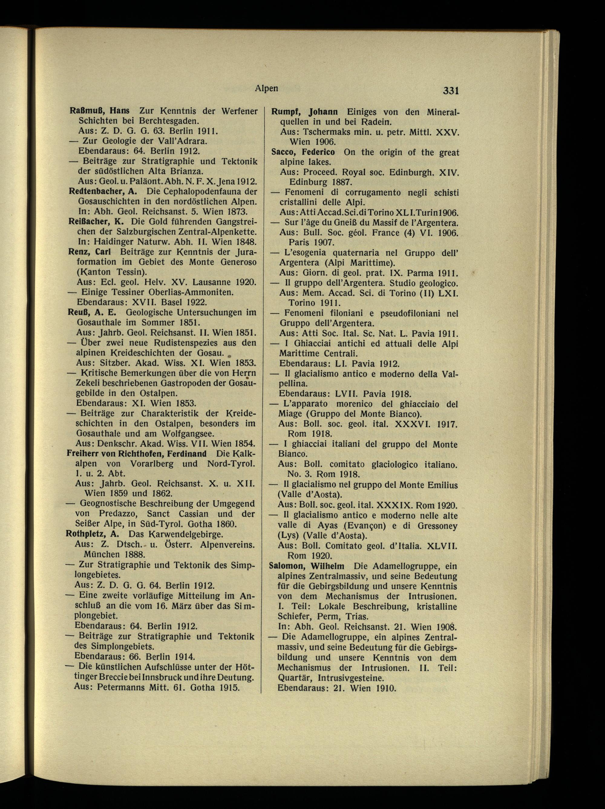 Aus : Geol. u. Paläont. Abh. N. F. X. Jena 1912. Redtenbacher, A. Die Cephalopodenfauna der Gosauschichten in den nordöstlichen Alpen. In: Abh. Geol. Reichsanst. 5. Wien 1873. Reißacher, K. Die Gold führenden Gangstreichen der Salzburgischen Zentral-Alpenkette. In: Haidinger Naturw. Abh. II. Wien 1848. Renz, Carl Beiträge zur Kenntnis der Juraformation im Gebiet des Monte Generoso (Kanton Tessin ).
