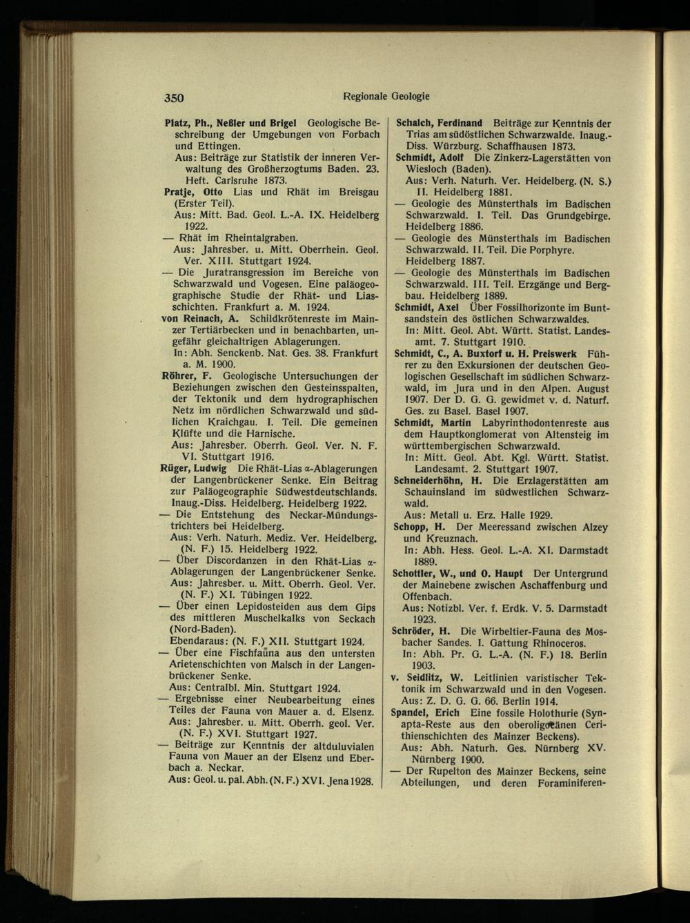 Schalch, Ferdinand Beiträge zur Kenntnis der Trias am südöstlichen Schwarzwalde. Inaug.- Diss. Würzburg . Schaffhausen 1873. Schmidt, Adolf Die Zinkerz-Lagerstätten von Wiesloch (Baden).