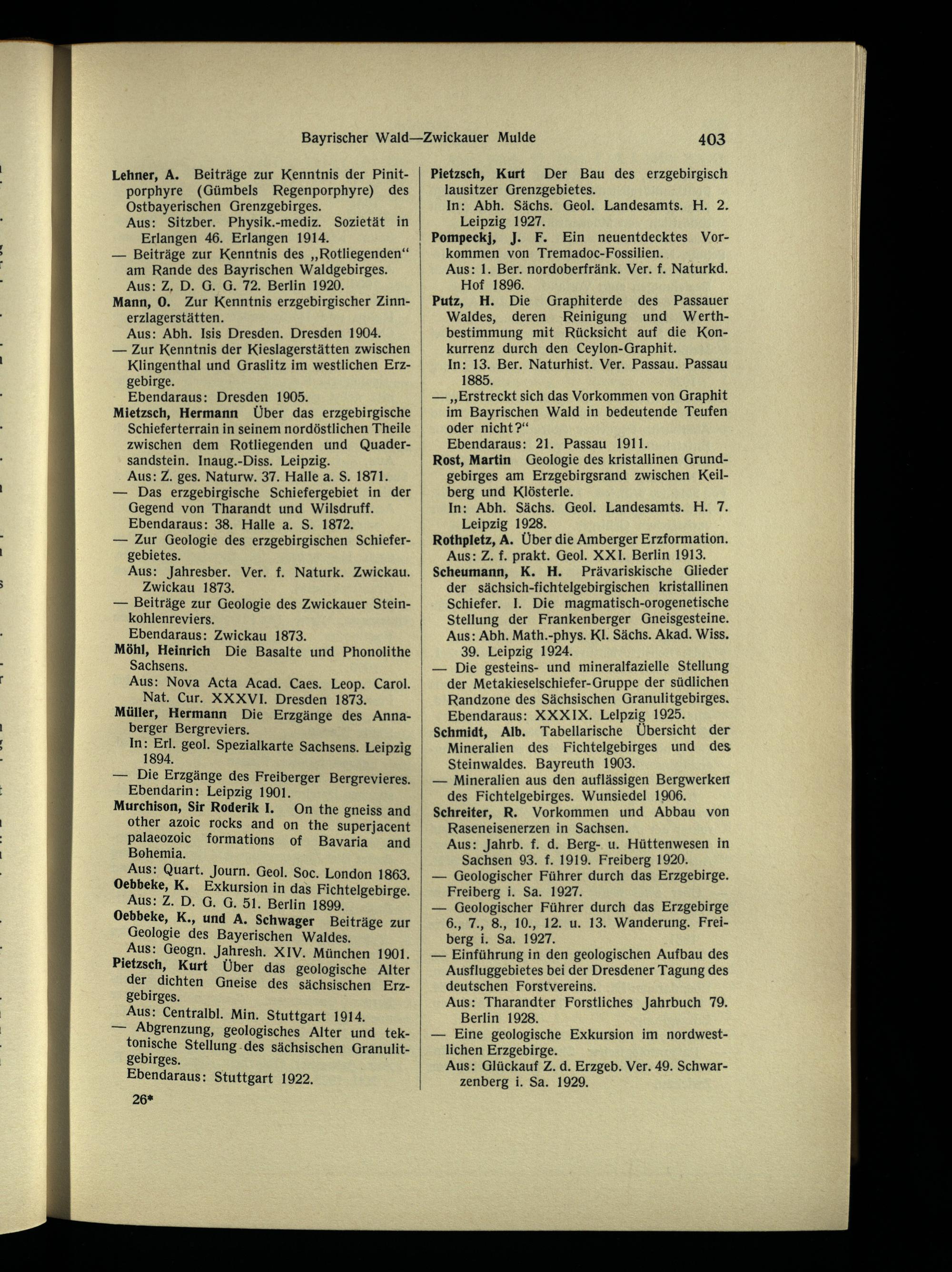 Aus: Z. f. prakt. Geol. XXI. Berlin 1913. Scheumann, K. H. Prävariskische Glieder der sächsich-fichtelgebirgischen kristallinen Schiefer. I. Die magmatisch-orogenetische Stellung der Frankenberger Gneisgesteine. Aus: Abh. Math.-phys. Kl. Sächs. Akad. Wiss. 39. Leipzig 1924.