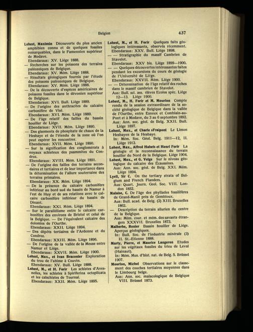Lohest, Max., Alfred Habets et Henri Forir La géologie et la reconnaissance du terrain houiller du Nord de la Belgique. Liège 1904. Lohest, Max., et G. Velge Sur le niveau géologique du calcaire des Écaussines.