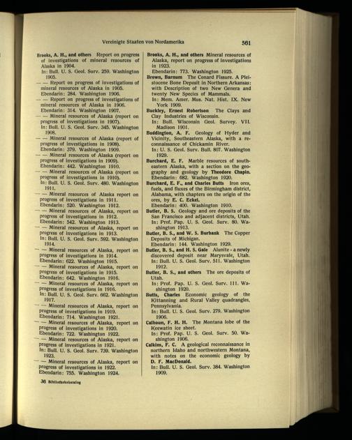 Burchard, E. F. Marble resources of southeastern Alaska , with a section on the geography and geology by Theodore Chapin. Ebendann: 682. Washington 1920. Burchard, E. F., and Charles Butts Iron ores, fuels, and fluxes of the Birmingham district, Alabama, with chapters on the origin of the ores, by E. C. Eckel.