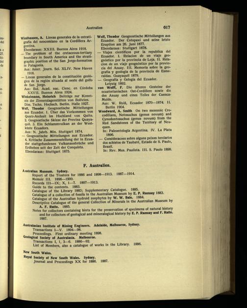 Winkelmann, Heinrich Beiträge zur Kenntnis der Zinnerzlagerstätten von Bolivien . Diss. Techn. Hochsch. Berlin . Halle 1927. Wolf, Theodor Geognostische Mitteilungen aus Ecuador . 1. Über das Vorkommen von Quarz-Andesit im Hochland von Quito . 2. Geognostische Skizze der Provinz Quaya- quil. 3. Ein Schlammvulkan an der Westküste Ecuadors .