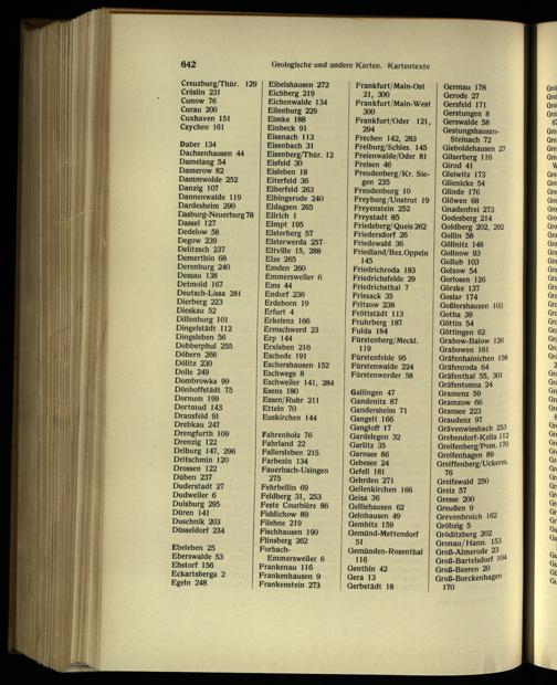 Eibelshausen 272 Eichberg 219 Eichenwalde 134 Eilenburg 229 Eimke 188 Einbeck 91 Eisenach 113 Eisen bach 31 Eisenberg/Thür. 12 Eisfeld 30 Eisleben 18 Eiterfeld 36 Elberfeld 263 Elbingerode 240 Eldagsen 265 Ellrich 1 Elmpt 195 Elsterberg 57 Elsterwerda 257 Eltville 15, 288 Elze 265 Emden 260 Emmersweiler 6 Ems 44 Endorf 236 Erdeborn 19 Erfurt 4 Erkelenz 166 Ermschwerd 23 Erp 144 Erxleben 216 Eschede 191 Eschershausen 152 Eschwege 8 Eschweiler 141, 284 Esens 180 Essen/Ruhr 211 Etteln 70 Euskirchen 144