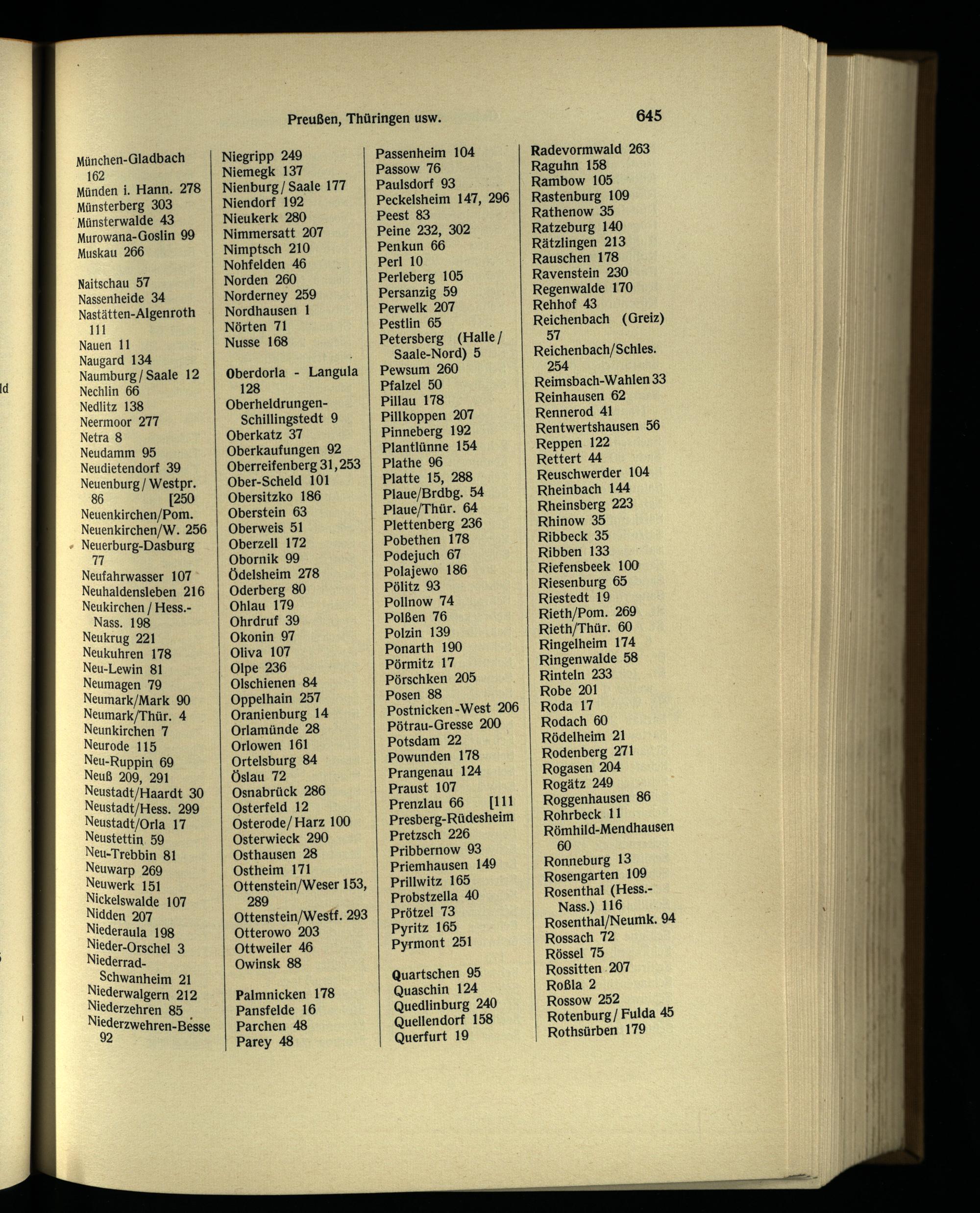 Neufahrwasser 107 Neuhaldensleben 216 Neukirchen / Hess.- Nass. 198 Neukrug 221 Neukuhren 178 Neu-Lewin 81 Neumagen 79 Neumark/Mark 90 Neumark/Thür. 4 Neunkirchen 7 Neurode 115 Neu-Ruppin 69 Neuß 209, 291 Neustadt/Haardt 30 Neustadt/Hess . 299 Neustadt/Orla 17 Neustettin 59 Neu-Trebbin 81 Neuwarp 269 Neuwerk 151 Nickelswalde 107 Nidden 207 Niederaula 198 Nieder-Orschel 3 Niederrad- Schwanheim 21 Niederwalgern 212 Niederzehren 85 Niederzwehren-Besse
