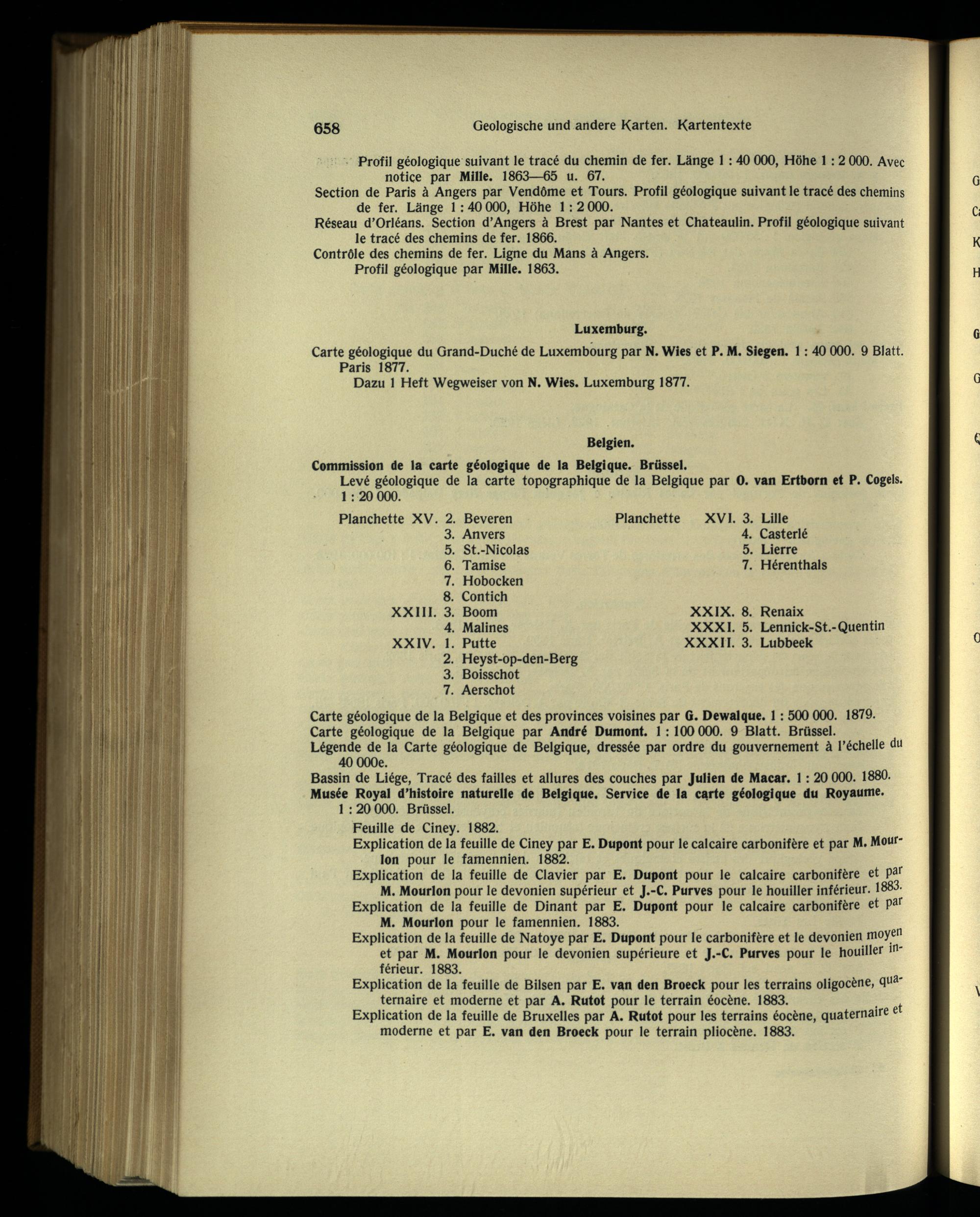 Carte géologique de la Belgique et des provinces voisines par G. Dewalque . 1: 500 000. 1879. Carte géologique de la Belgique par André Dumont. 1:100 000. 9 Blatt. Brüssel .