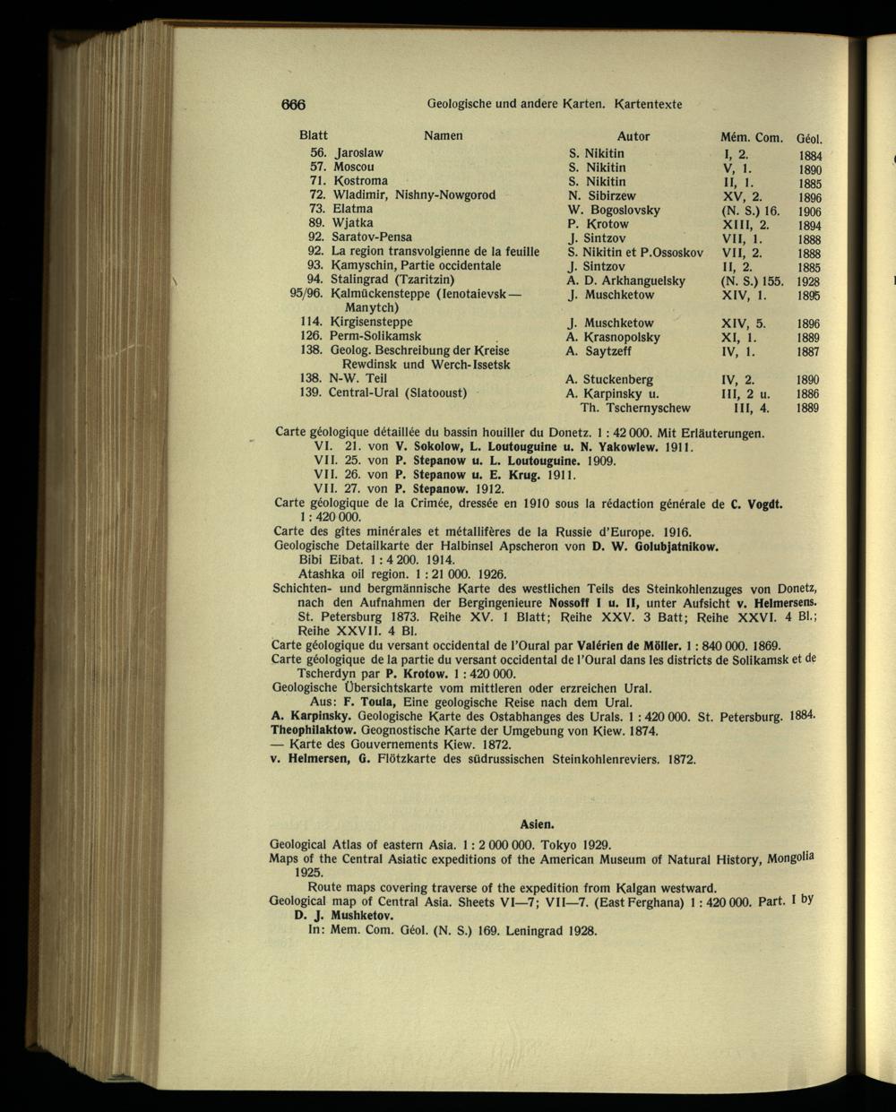 Schichten- und bergmännische Karte des westlichen Teils des Steinkohlenzuges von Donetz, nach den Aufnahmen der Bergingenieure Nossoff I u. II, unter Aufsicht v. Helmersens. St. Petersburg 1873. Reihe XV. 1 Blatt; Reihe XXV. 3 Batt; Reihe XXVI. 4 BI.; Reihe XXVII. 4 Bl.