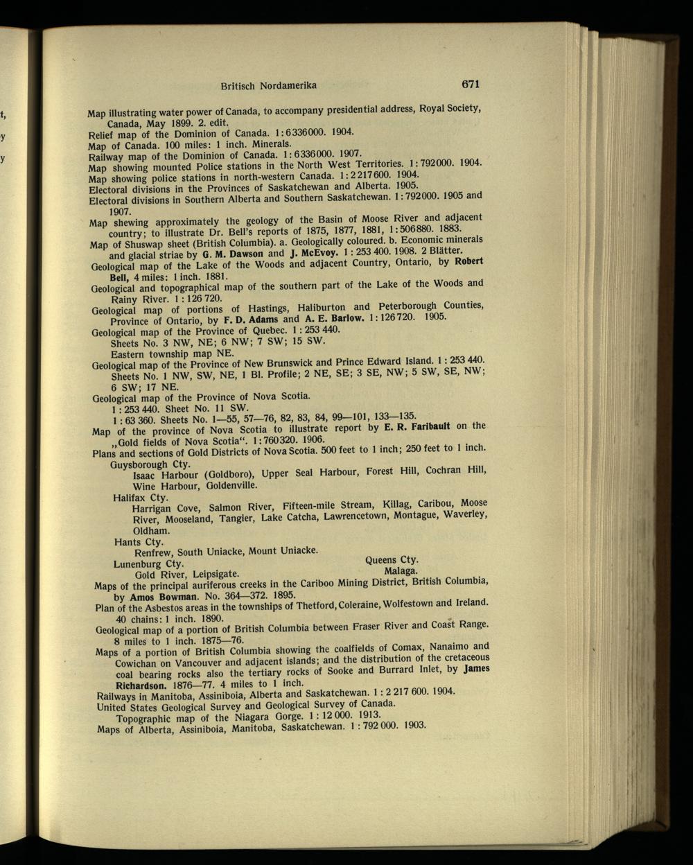 Map of Shuswap sheet (British Columbia ), a. Geologically coloured, b. Economic minerals and glacial striae by G. M. Dawson and J. McEvoy. 1 : 253 400. 1908. 2 Blätter. Geological map of the Lake of the Woods and adjacent Country, Ontario , by Robert Bell, 4 miles: 1 inch. 1881.