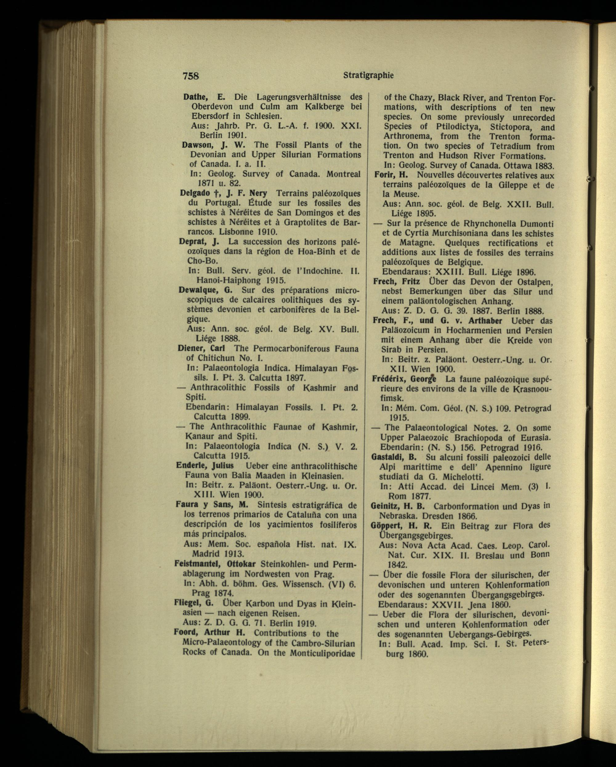 of the Chazy, Black River, and Trenton Formations, with descriptions of ten new species. On some previously unrecorded Species of Ptilodictya, Stictopora, and Arthronema, from the Trenton formation. On two species of Tetradium from Trenton and Hudson River Formations. In: Geolog. Survey of Canada. Ottawa 1883. Forir, H. Nouvelles découvertes relatives aux terrains paléozoïques de la Gileppe et de la Meuse.