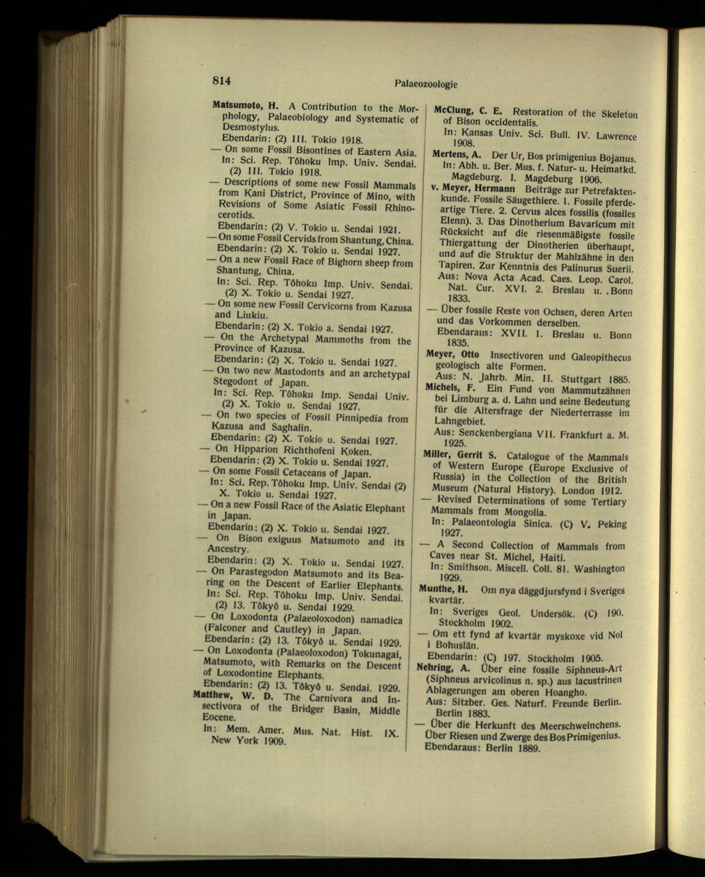 Mertens, A. Der Ur, Bos primigenius Bojanus . In: Abh. u. Ber. Mus. f. Natur- u. Heimatkd. Magdeburg . I. Magdeburg 1906. v. Meyer, Hermann Beiträge zur Petrefakten- kunde. Fossile Säugethiere. 1. Fossile pferdeartige Tiere. 2. Cervus alces fossilis (fossiles ! Elenn). 3. Das Dinothérium Bavaricum mit