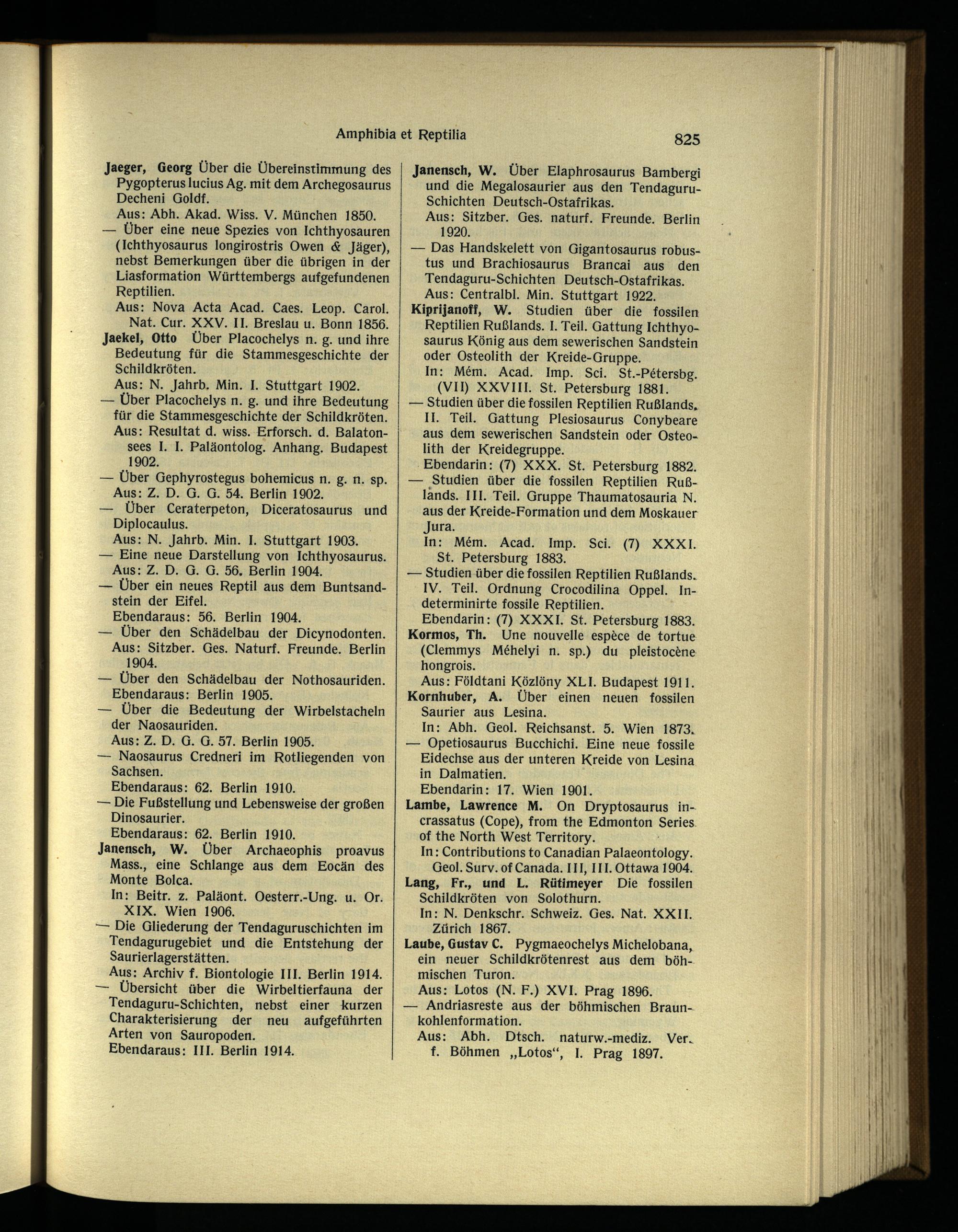 — Über Placochelys n. g. und ihre Bedeutung für die Stammesgeschichte der Schildkröten. Aus: Resultat d. wiss. Erforsch, d. Balatonsees I. I. Paläontolog. Anhang. Budapest 1902.