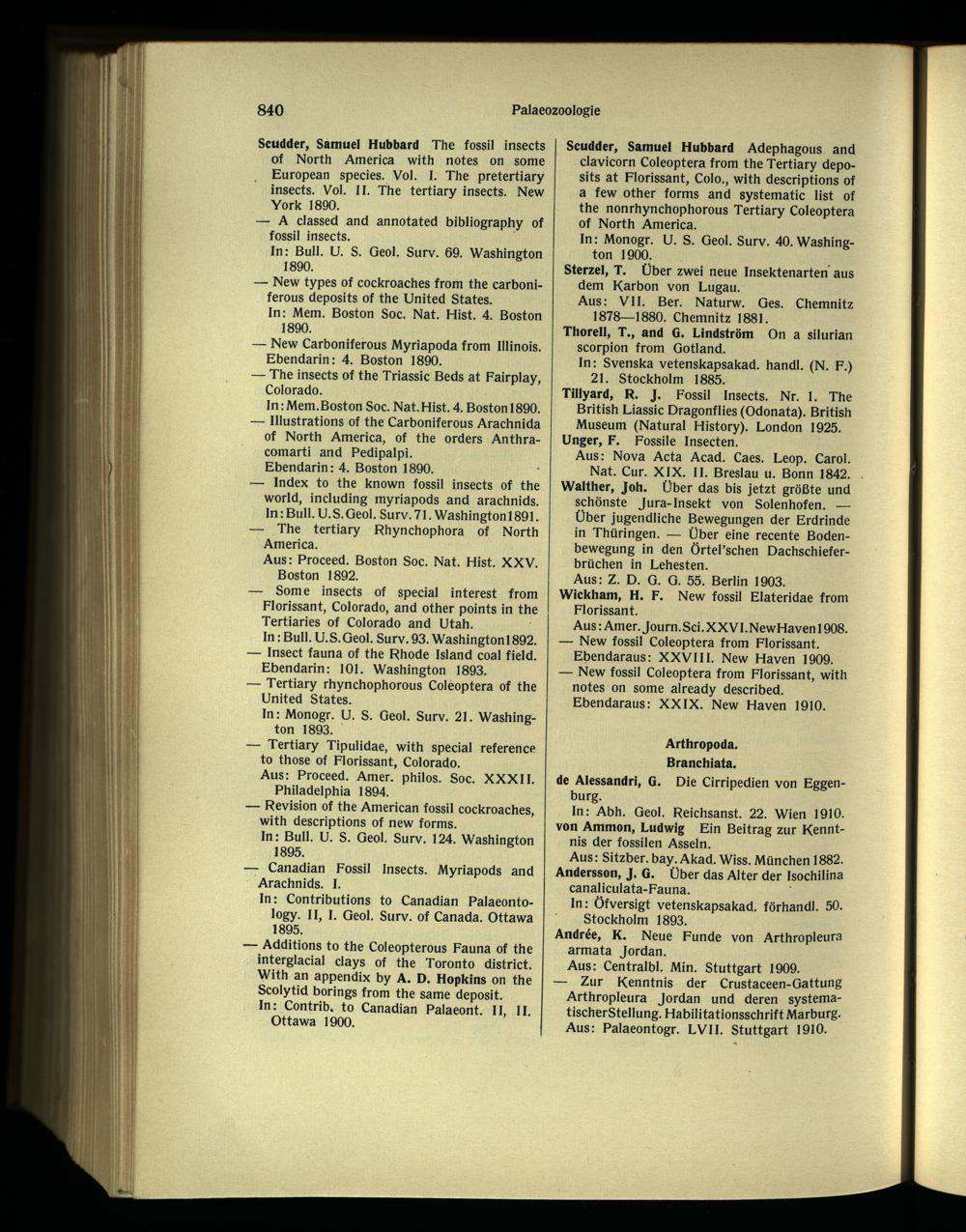 Scudder, Samuel Hubbard The fossil insects of North America with notes on some European species. Vol. I. The pretertiary insects. Vol. II. The tertiary insects. New York 1890.
