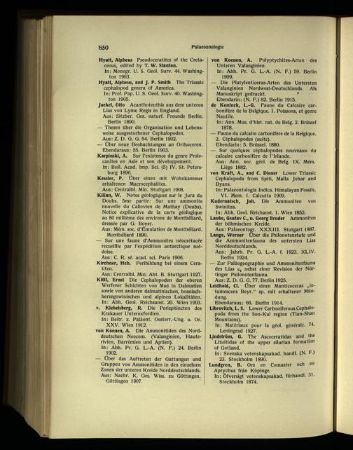 Aus: Centralbl. Min. Abt. B. Stuttgart 1927. Kittl, Ernst Die Cephalopoden der oberen Werfener Schichten von Mué in Dalmatien sowie von anderen dalmatinischen, bosnisch- herzegowinischen und alpinen Lokalitäten. In: Abh. Geol. Reichsanst. 20. Wien 1903. V. Klebeisberg, R. Die Perisphincten des Krakauer Unteroxfordien.