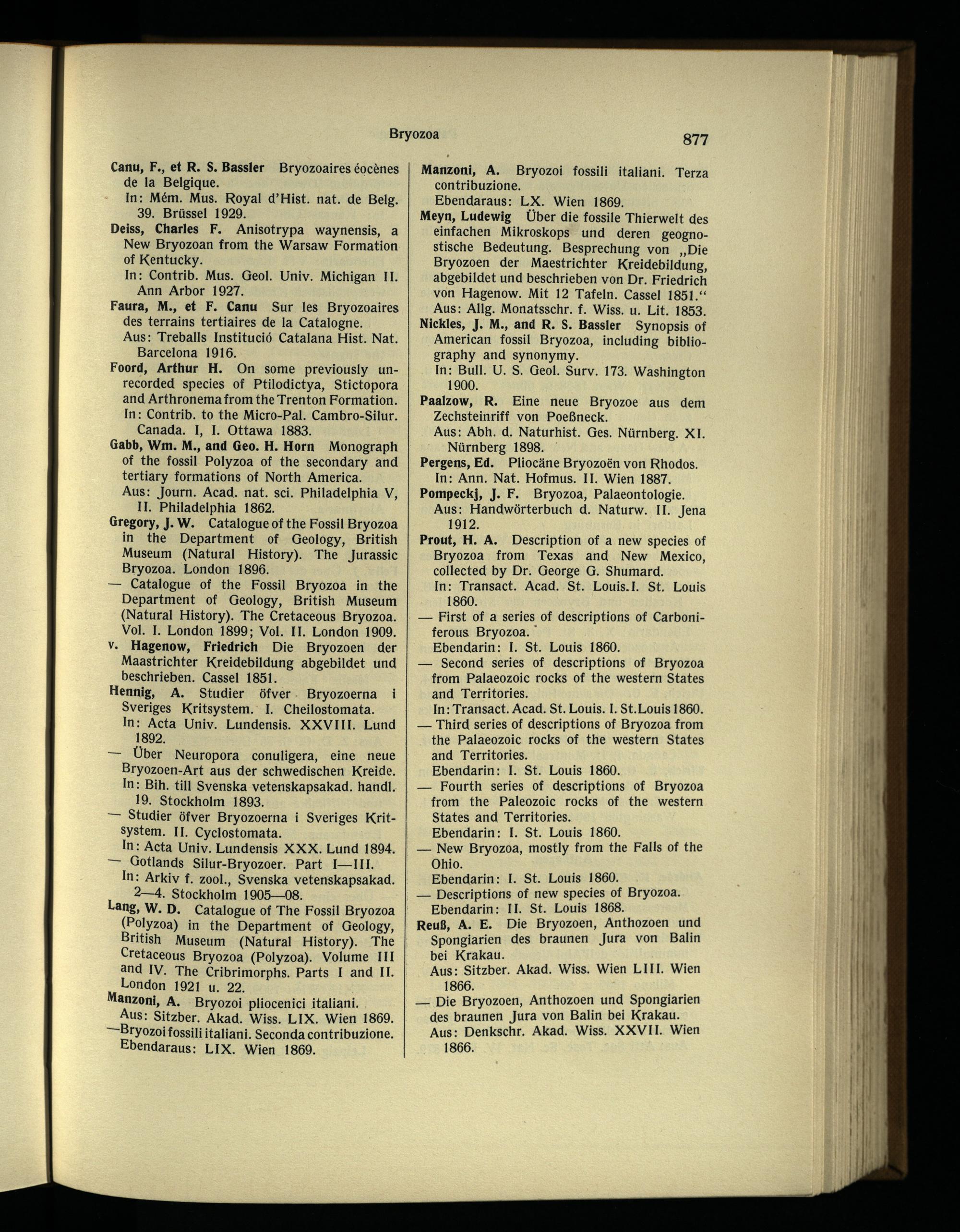 Meyn, Ludewig Über die fossile Thierwelt des einfachen Mikroskops und deren geogno- stische Bedeutung. Besprechung von „Die Bryozoen der Maestrichter Kreidebildung, abgebildet und beschrieben von Dr. Friedrich von Hagenow. Mit 12 Tafeln. Cassel 1851.“ Aus: Allg. Monatsschr. f. Wiss. u. Lit. 1853. Nickles, J. M., and R. S. Bassler Synopsis of American fossil Bryozoa, including bibliography and synonymy.