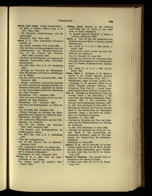 Stopes, Marie C. Catalogue of the Mesozoic Plants in the British Museum (Natural History). The Cretaceous Flora. Part I. — Bibliography, Algae & Fungi . London 1913.