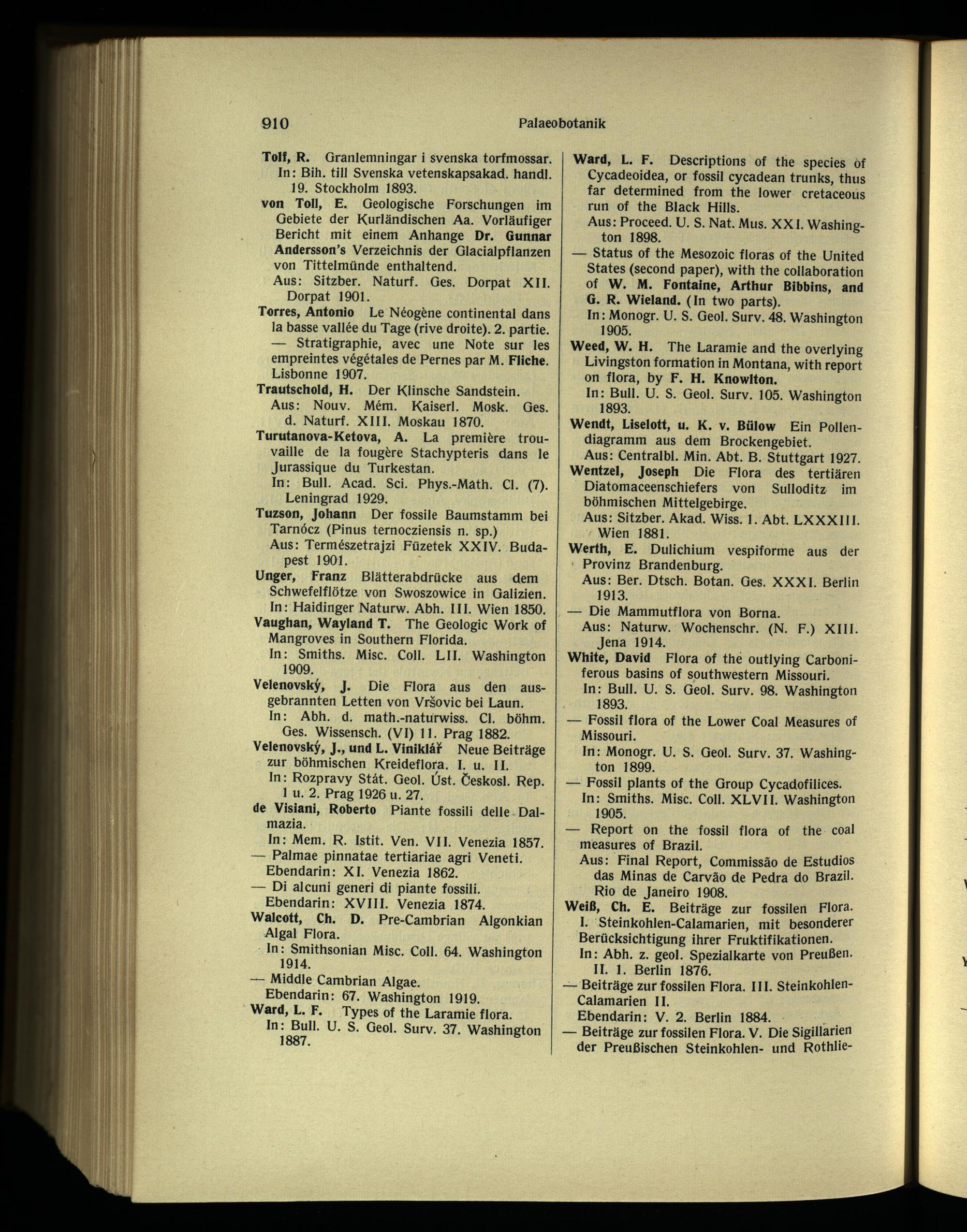 — Status of the Mesozoic floras of the United States (second paper), with the collaboration of W. M. Fontaine, Arthur Bibbins, and G. R. Wieland. (In two parts).