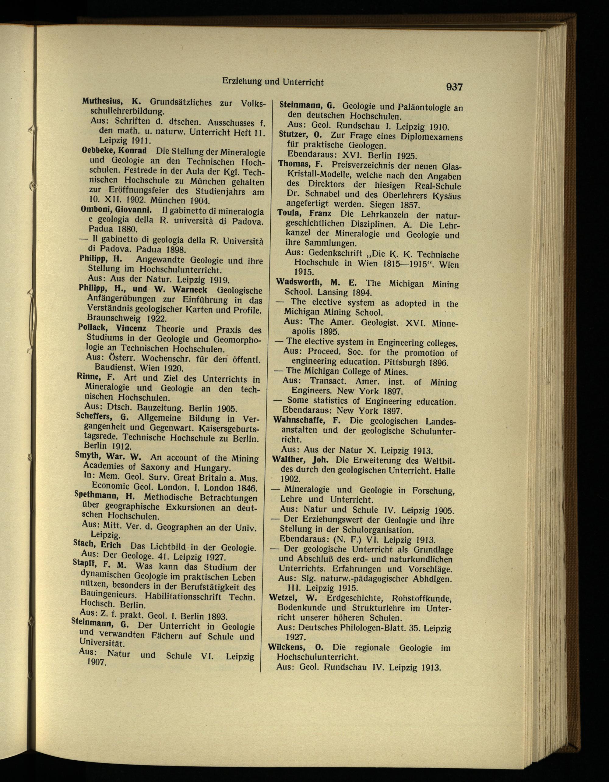 — Der Erziehungswert der Geologie und ihre Stellung in der Schulorganisation. Ebendaraus: (N. F.) VI. Leipzig 1913.