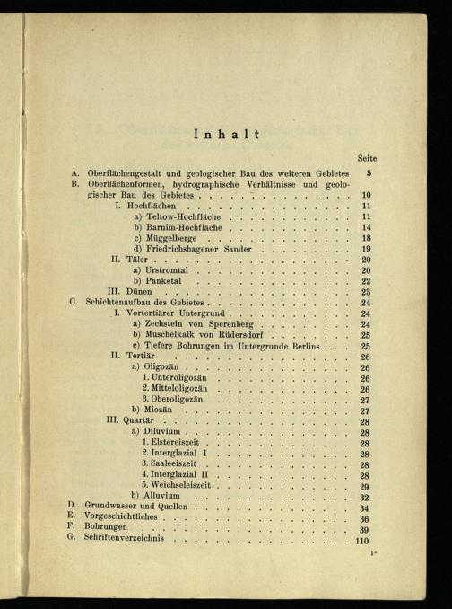 Oberflächengestalt und geologischer Bau des weiteren Gebietes Oberflächenformen, hydrographische Verhältnisse und geologischer Bau des Gebietes. I. Hochflächen. a) Teltow- Hochfläche b) Barnim-Hochfläche c) Müggelberge; d) Friedrichshagener Sander hen ze H. Täler 2 NN a) Urstromtal b) Panketal III. Dünen Schichtenaufbau des Gebietes I. Vortertiärer Untergrund. a) Zechstein von Sperenberg b) Muschelkalk von Rüdersdorf .. c) Tiefere Bohrungen im Untergrunde Berlins ; ]I. Tertiär a) Oligozän . 1. Unteroligozän 2, Mitteloligozän 3. Oberoligozän b) Miozän III. Quartär a) Diluvium. 1. Elstereiszeit. 2, Interglazial I 3. Saaleeiszeit 4. Interglazial II. 5. Weichseleiszeit. b) Alluvium Grundwasser und Quellen Vorgeschichtliches, Bohrungen Schriftenverzeichnis