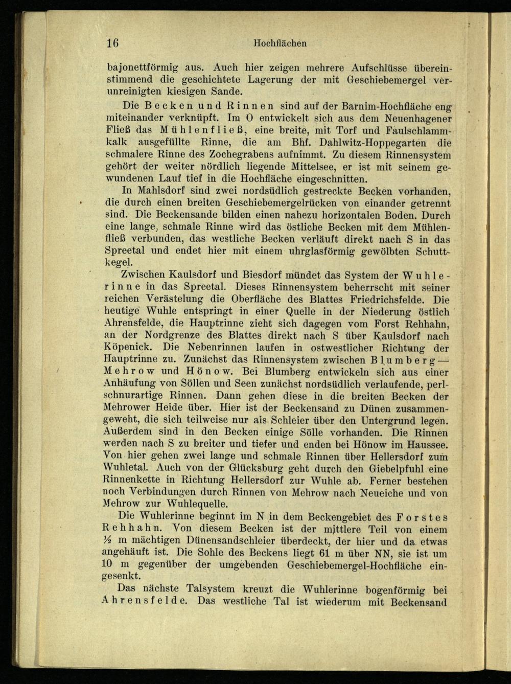 Zwischen Kaulsdorf und Biesdorf mündet das System der Wuhlerinne in das Spreetal . Dieses Rinnensystem beherrscht mit seiner reichen Verästelung die Oberfläche des Blattes Friedrichsfelde . Die heutige Wuhle entspringt in einer Quelle in der Niederung östlich Ahrensfelde , die Hauptrinne zieht sich dagegen vom Forst Rehhahn, an der Nordgrenze des Blattes direkt nach S über Kaulsdorf nach Köpenick . Die Nebenrinnen laufen in ostwestlicher Richtung der Hauptrinne zu. Zunächst das Rinnensystem zwischen Blumberg -— Mehrow und Hönow . Bei Blumberg entwickeln sich aus einer Anhäufung von Söllen und Seen zunächst nordsüdlich verlaufende, perlschnurartige Rinnen. Dann gehen diese in die breiten Becken der Mehrower Heide über. Hier ist der Beckensand zu Dünen zusammengeweht, die sich teilweise nur als. Schleier über den Untergrund legen. Außerdem sind in den Becken einige Sölle vorhanden. Die Rinnen werden nach S zu breiter und tiefer und enden bei Hönow im Haussee. Von-hier gehen zwei lange und schmale Rinnen über Hellersdorf zum Wuhletal. Auch von der Glücksburg geht durch den Giebelpfuhl eine Rinnenkette in Richtung Hellersdorf zur Wuhle ab. Ferner bestehen noch Verbindungen durch Rinnen von Mehrow nach Neueiche und von Mehrow zur Wuhlequelle.