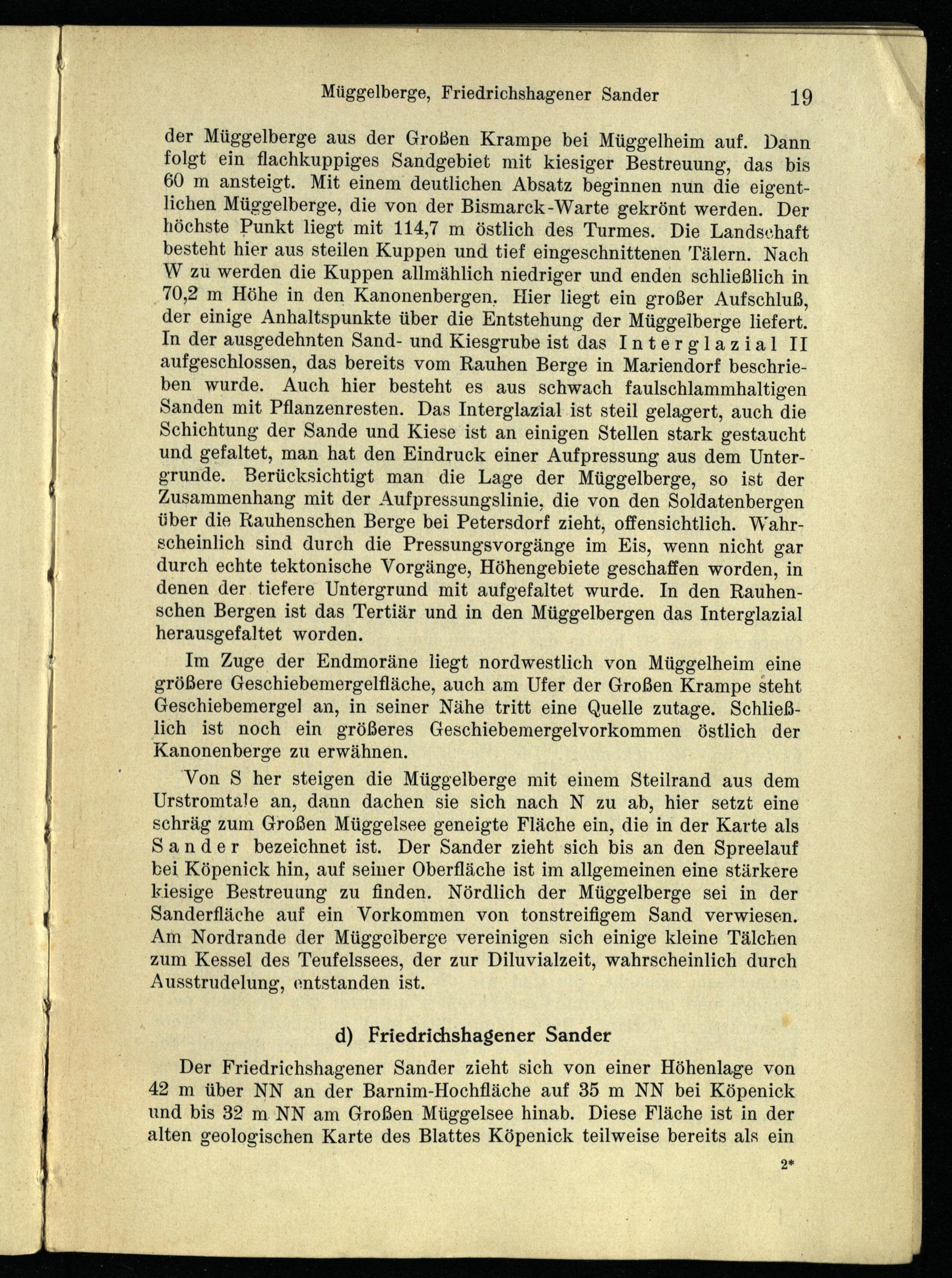 Von S her steigen die Müggelberge mit einem Steilrand aus dem Urstromtale an, dann dachen sie sich nach N zu ab, hier setzt eine schräg zum Großen Müggelsee geneigte Fläche ein, die in der Karte als Sander bezeichnet ist. Der Sander zieht sich bis an den Spreelauf bei Köpenick hin, auf seiner Oberfläche ist im allgemeinen eine stärkere kiesige Bestreuung zu finden. Nördlich der Müggelberge sei in der Sanderfläche auf ein Vorkommen von tonstreifigem Sand verwiesen. Am Nordrande der Müggelberge vereinigen sich einige kleine Tälchen zum Kessel des Teufelssees, der zur Diluvialzeit, wahrscheinlich durch