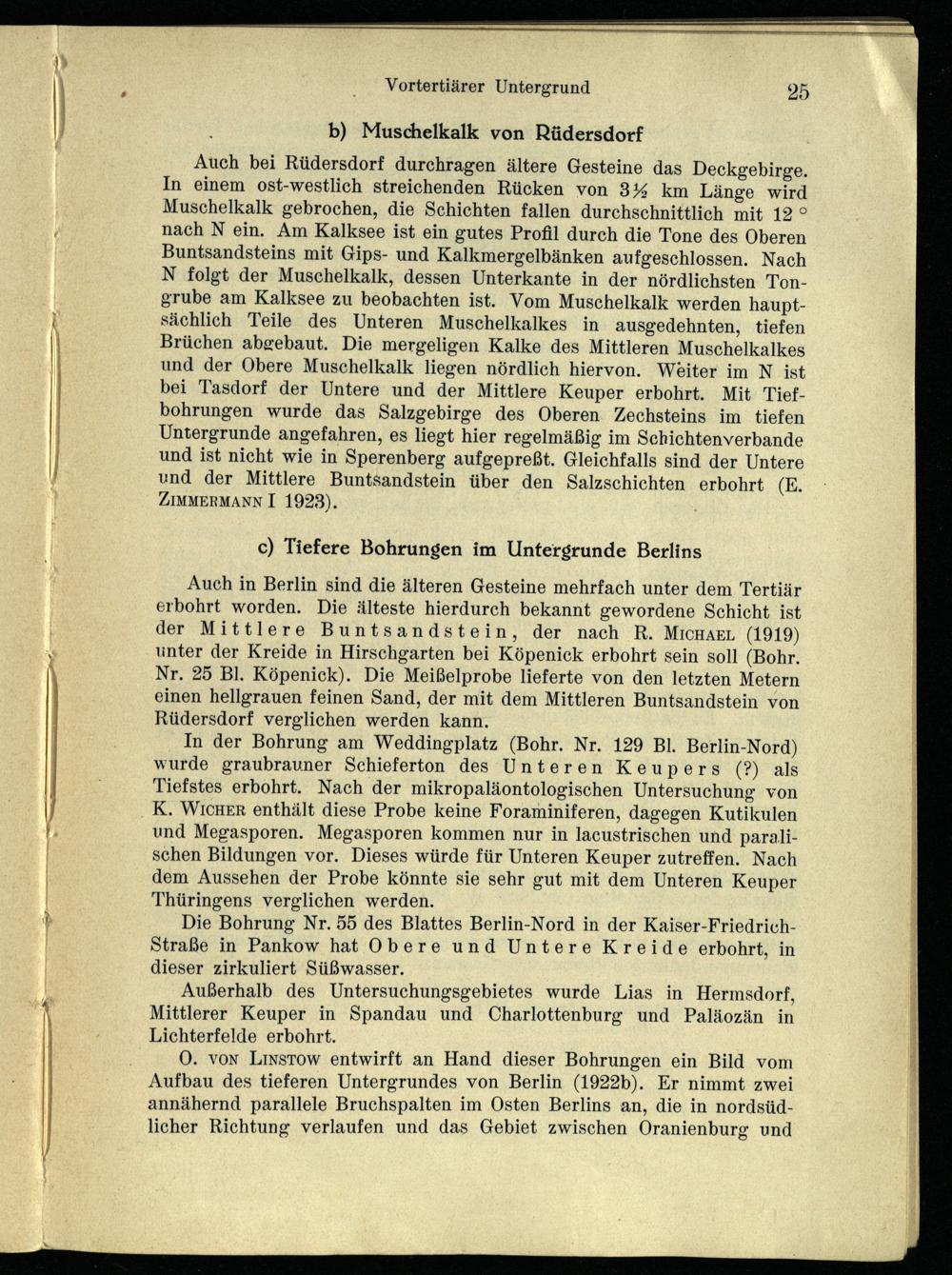 O0. von LiysTow entwirft an Hand dieser Bohrungen ein Bild vom Aufbau des tieferen Untergrundes von Berlin (1922b). Er nimmt zwei annähernd parallele Bruchspalten im Osten Berlins an, die in nordsüdlicher Richtung verlaufen und das Gebiet zwischen Oranienburg und