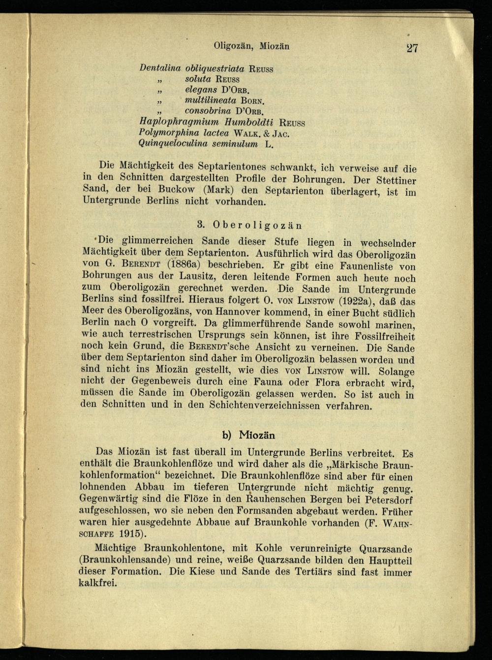 Die glimmerreichen Sande dieser Stufe liegen in wechselnder Mächtigkeit über dem Septarienton. Ausführlich wird das Oberoligozän von G. BERENDT(1886a) beschrieben. Er gibt eine Faunenliste von Bohrungen aus der Lausitz , deren leitende Formen auch heute noch zum Oberoligozän gerechnet werden. Die Sande im Untergrunde Berlins sind fossilfrei. Hieraus folgert 0. von LInsTow(1922a), daß das Meer des Oberoligozäns, von Hannover kommend, in einer Bucht südlich Berlin nach O0 vorgreift. Da glimmerführende Sande sowohl marinen, wie auch terrestrischen Ursprungs sein können, ist ihre Fossilfreiheit noch kein Grund, die BERENDT’sche Ansicht zu verneinen. Die Sande über dem Septarienton sind daher im Oberoligozän belassen worden und sind nicht ins Miozän gestellt, wie dies von LıinsTow will. Solange nicht der Gegenbeweis durch eine Fauna oder Flora erbracht wird, müssen die Sande im Oberoligozän. gelassen werden. So ist auch in den Schnitten und in den Schichtenverzeichnissen verfahren.