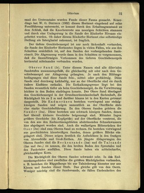 sand des Urstromtales wurden Funde dieser Fauna gemacht. Neuerdings hat W. O0. DiETrRICH(1932) diesen Horizont eingehend auf seine Fossilführung untersucht, er kommt durch den Erhaltungszustand zu dem Schluß, daß die Knochenreste aus moorigen Schichten stammen und durch eine Umlagerung in die Sande des Rixdorfer Niveaus eingebettet wurden. Ob daher diesem Rixdorfer Horizont eine selbständige Stellung als Interglazial zukommt, ist fraglich.