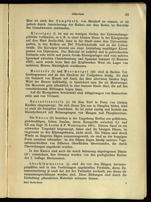 Kieselgur(i) ist nur an wenigen Stellen des Untersuchungsgebietes vorhanden, so z. B. in einer kleinen Rinne in der Königsheide auf dem Blatt Berlin -Süd, dann in der Stadt unter dem Universitätsgarten, in den Kolken am Bhf. Friedrichstraße und an der Luisenstraße. Die Kieselgur besteht aus einer Anhäufung unzähliger Kieselpanzer von Diatomeen. Das Material ist kalkfrei und in getrocknetem Zustande sehr leicht und porös. Große Kieselgurlager sind vom unteren Spreelauf zwischen Charlottenburg und Spandau bekannt(G. BERENDT 1897), auch wurde beim Bau des Kraftwerkes West ein Lager von mehreren Metern Mächtigkeit erschlossen.