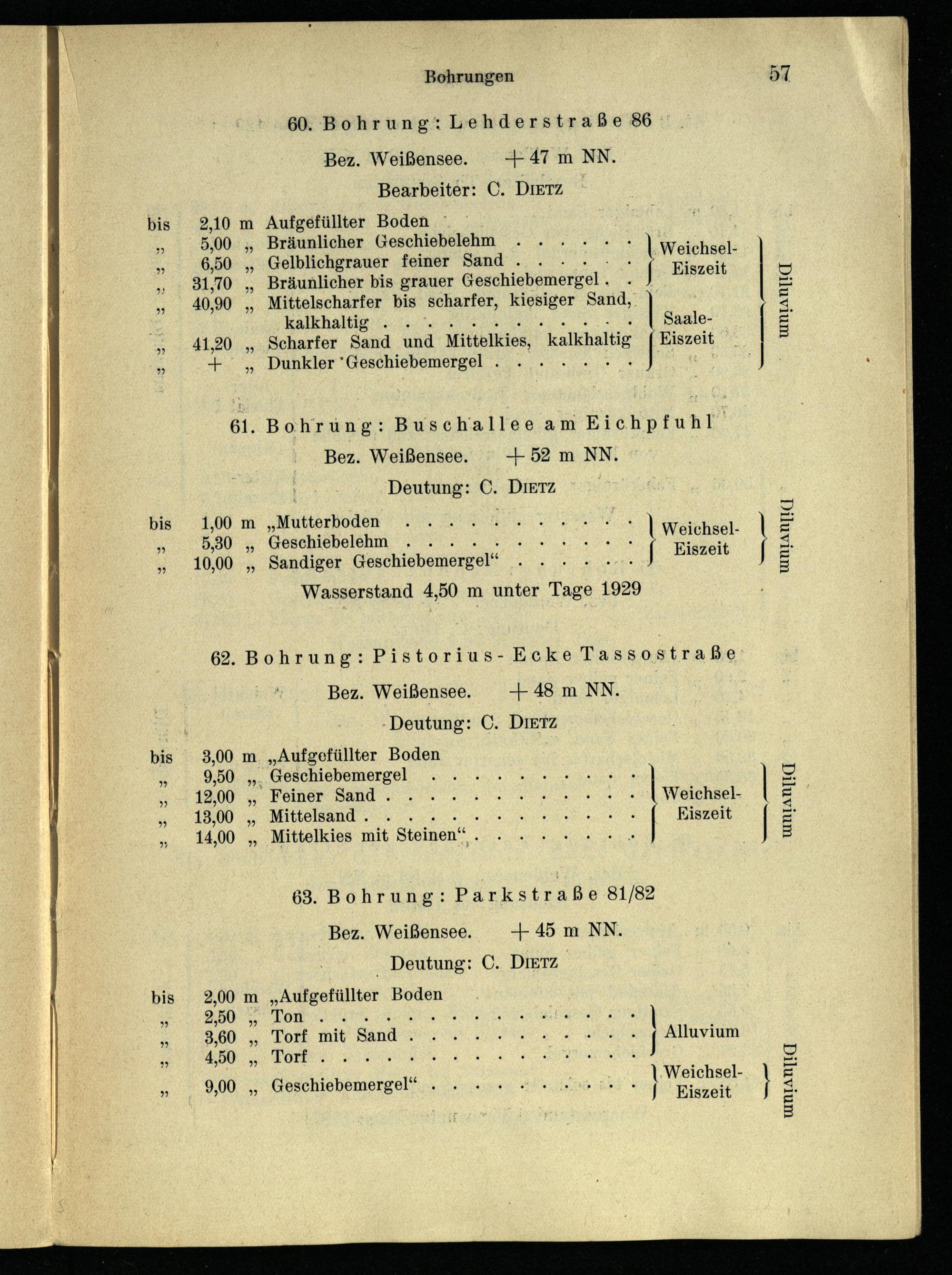 „31,70„„ Bräunlicher bis grauer Geschiebemergel Eiszeit S \„ 40,90°;, Mittelscharfer bis scharfer, ze Sand, e ) kalkhaltig..„| Saale - E „41,20„Scharfer Sand and Mittelkies, kalkhaltig Eiszeit 2 »+„ Dunkler‘Geschiebemergel.. 61. Bohrung: Buschallee am Eichpfuhl | Bez. Weißensee.+52 m NN. ? Deutung: C. DIETZ bis 1,00 m„Mutterboden‘... 44 x S ” 5,80% Geschiebelehm Den nn| Weichsel ) z %„10,00„ Sandiger Geschiebemergel“. 4 170) 5 Wasserstand 4,50 m unter Tape 1 1929 N 62. Bohrung: Pistorius- Ecke Tassostraße Bez. Weißensee.+48 m NN. | Deutung: C. DIETZ bis 3,00 m.„Aufgefüllter Boden 9,50„.. Geschiebemergel N S % 12,00 ,, Feiner Sand+. He Weichsel- S “ 13,00„ Mittelsand... ee Eiszeit Se „14,00„„ Mittelkies mit Steinen“« a 3 63. Bohrung: Parkstraße 81/82 Bez. Weißensee.+45 m NN. Deutung: C. DIETZ bis 2,00 m_Aukgefüllter Boden in 250 2 Ton.. EN | 60»"Torf mit‘ Sand#1... 004 Wil | attuvium He 4,50. ,, Torf. EN }= n 9,00„ Gesehlebemergeltr 201. 00+ FE & s B
