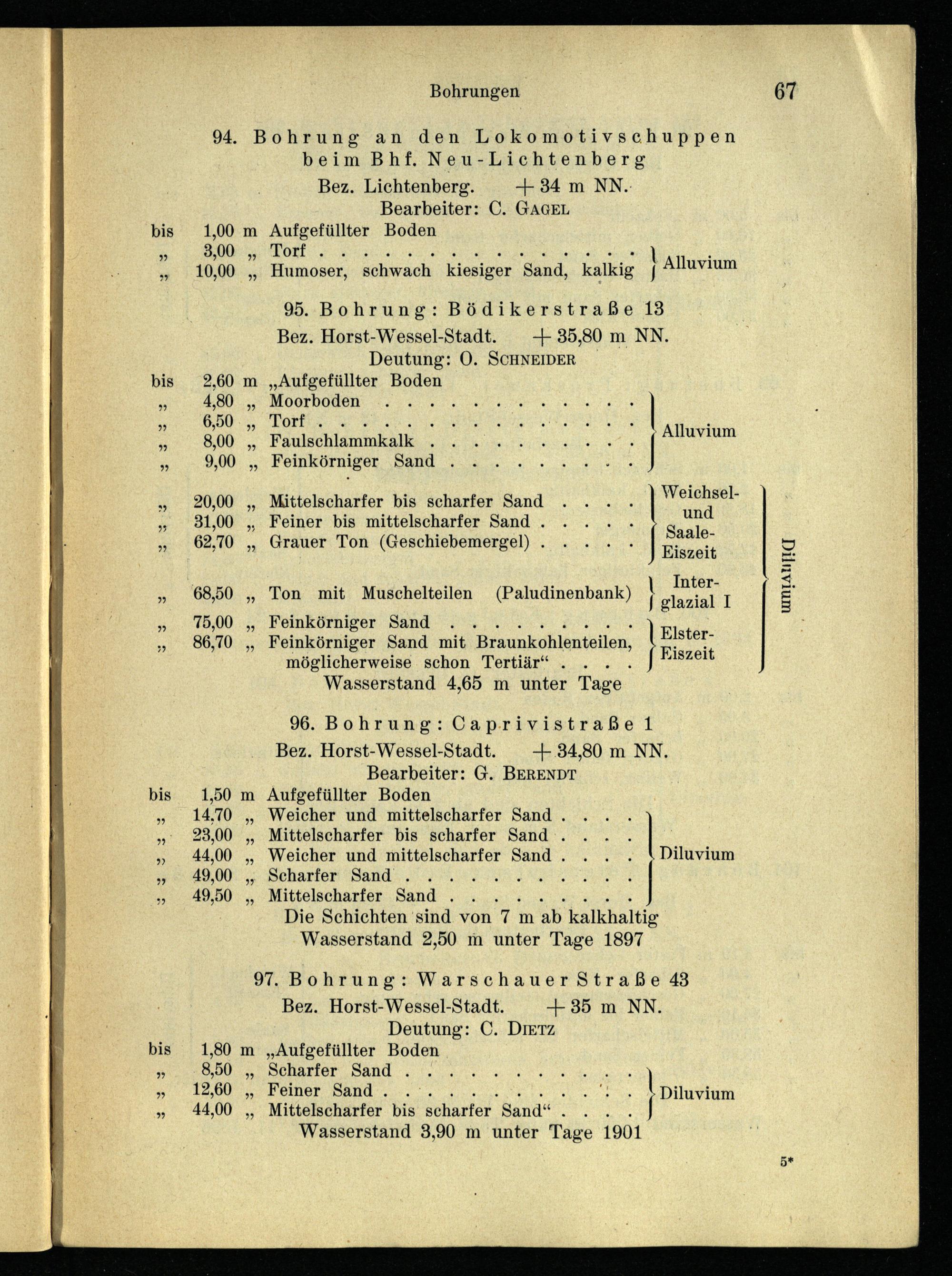 Bez. Horst-Wessel-Stadt.—+34,80 m NN. Bearbeiter: G. BERENDT Aufgefüllter Boden Weicher und mittelscharfer Sand. Mittelscharfer bis scharfer Sand‘....| Weicher und mittelscharfer Sand....\Diluvium Scharfer Sand... Mittelscharfer Sand... Die Schichten sind von 7) m ab kalkhaltig Wasserstand 2,50 m unter Tage 1897