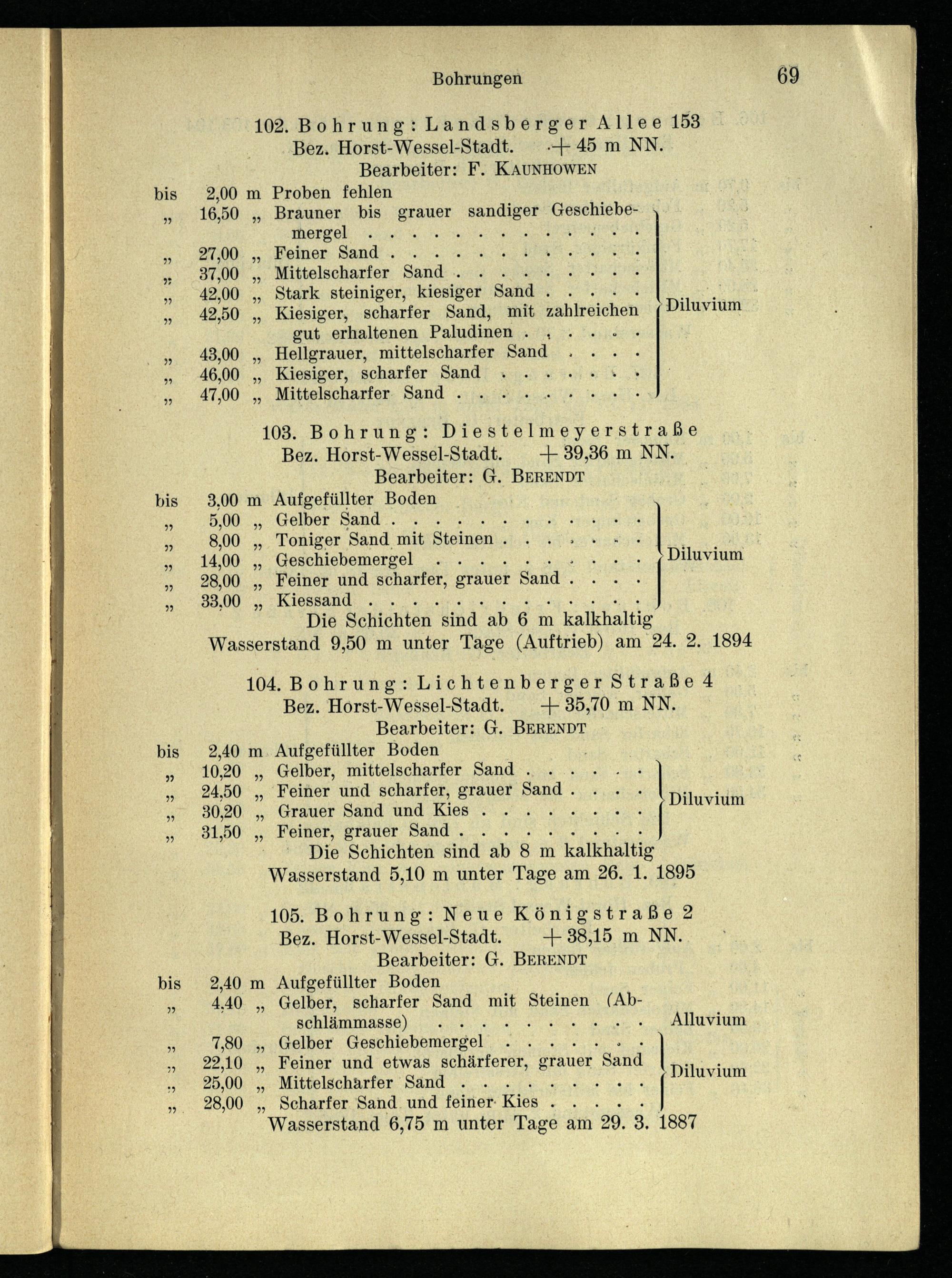 102. Bohrung: Landsberger Allee 153 Bez. Horst-Wessel-Stadt..+ 45 m NN . Bearbeiter: F. KAUNHOWEN 2,00 m Proben fehlen 16,50„ Brauner bis grauer sandiger Geschiebe
