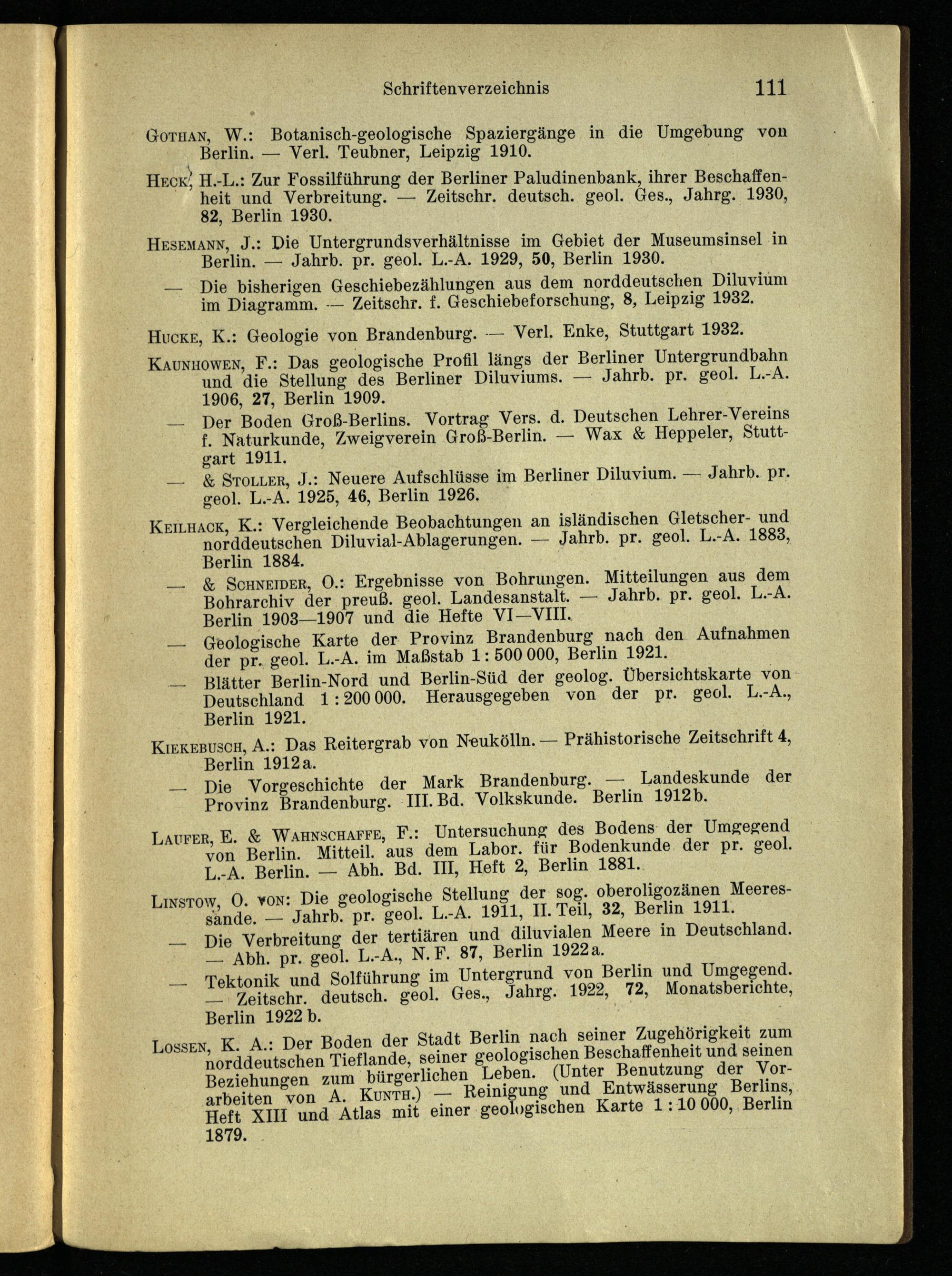KAUNHOWEN, F.: Das geologische Profil längs der Berliner Untergrundbahn und die Stellung des Berliner Diluviums.— Jahrb. pr. geol. L.-A. 1906, 27, Berlin 1909. Der Boden Groß-Berlins . Vortrag Vers. d. Deutschen Lehrer-Vereins f. Naturkunde, Zweigverein Groß-Berlin.— Wax& Heppeler, Stutt gart 1911. & STOLLER, J.: Neuere Aufschlüsse im Berliner Diluvium.— Jahrb. pr. geol. L.-A. 1925, 46, Berlin 1926.