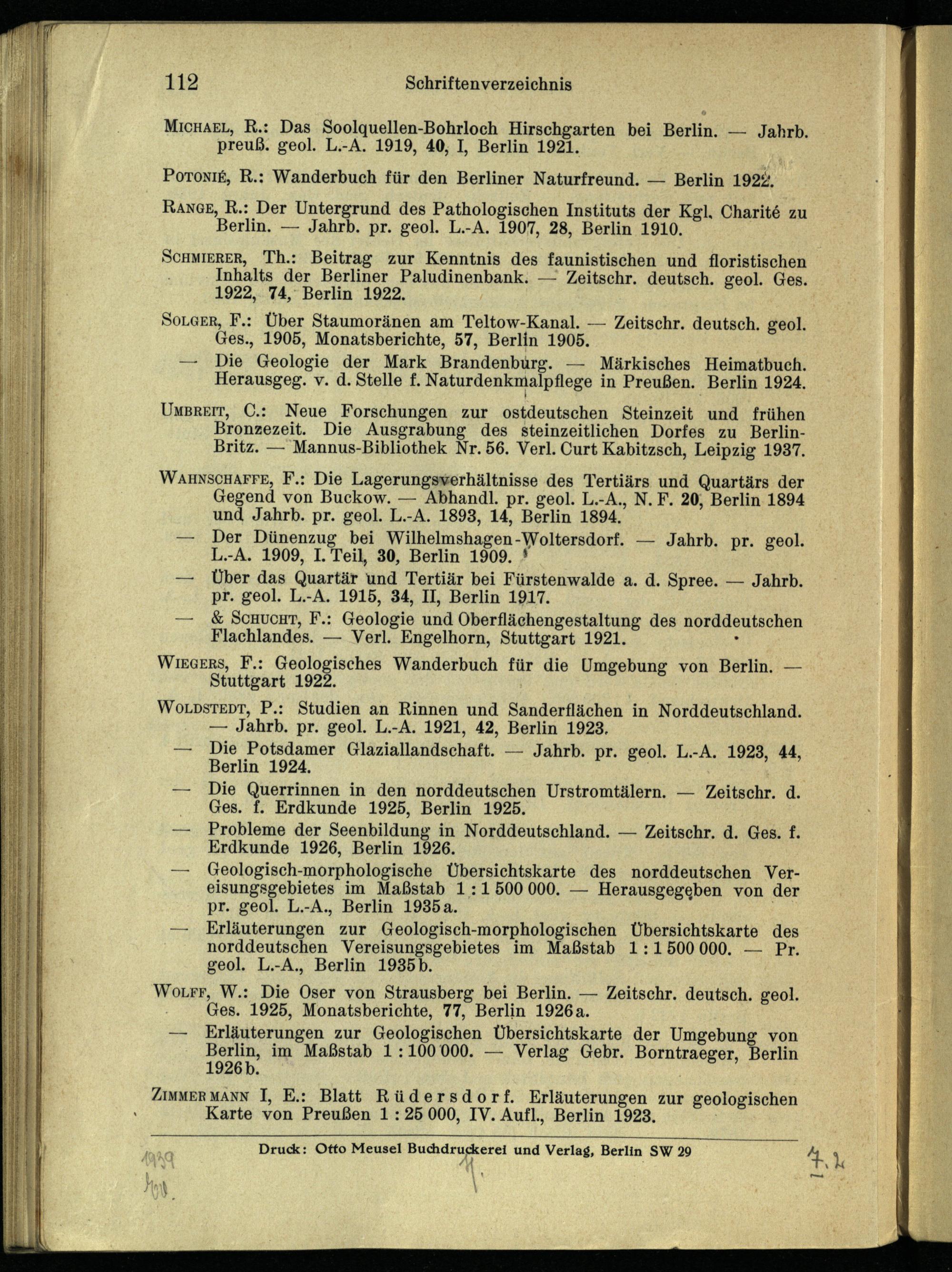 SCHMIERER, Th.: Beitrag zur Kenntnis des faunistischen und floristischen Inhalts der Berliner Paludinenbank.— Zeitschr. deutsch. geol. Ges. 1922, 74, Berlin 1922,