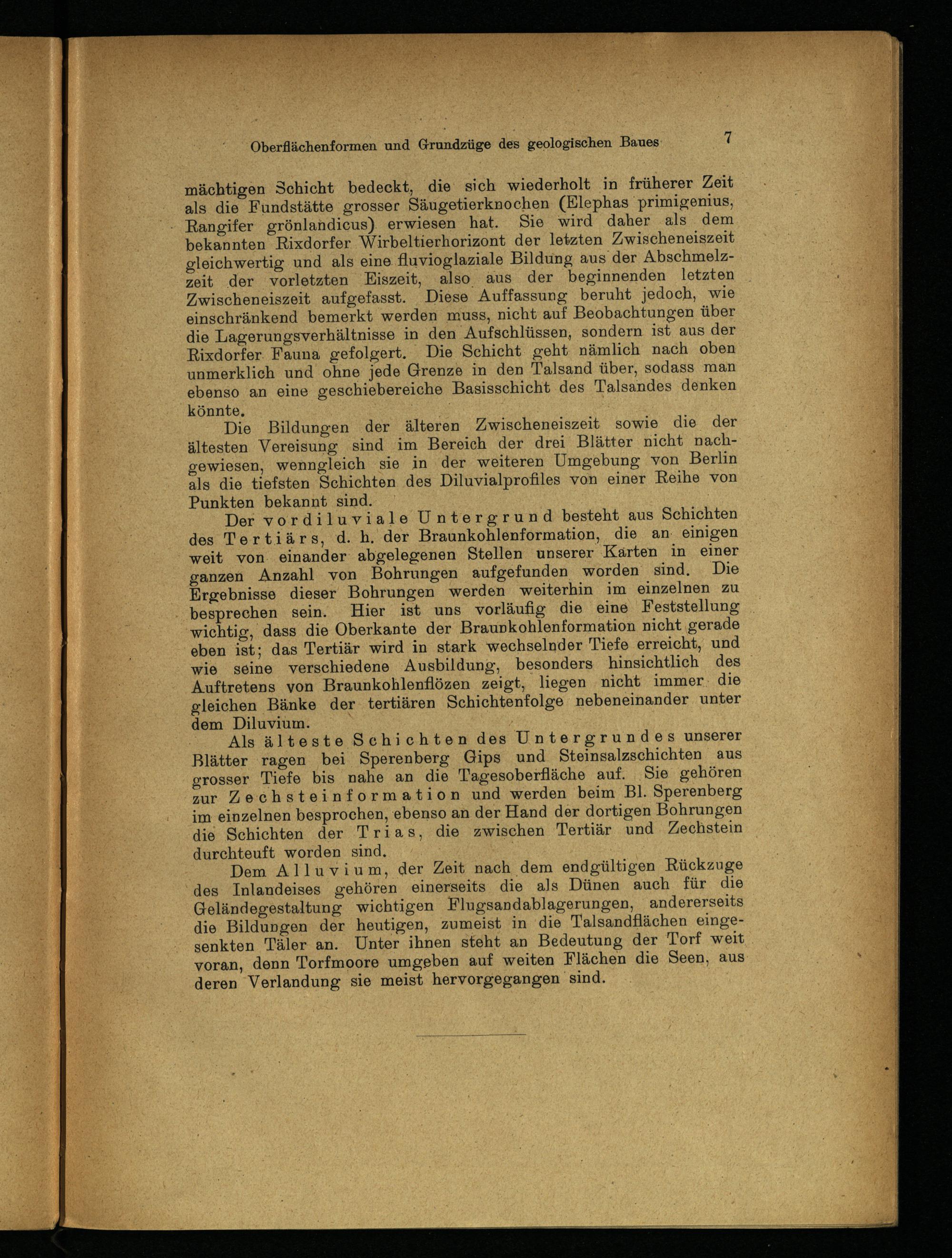 Die Bildungen der älteren Zwischeneiszeit sowie die der ältesten Vereisung sind im Bereich der drei Blätter nicht nachgewiesen, wenngleich sie in der weiteren Umgebung von Berlin als die tiefsten Schichten des Diluvialprofiles von einer Reihe von Punkten bekannt sind.